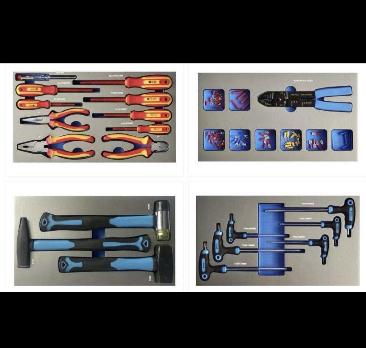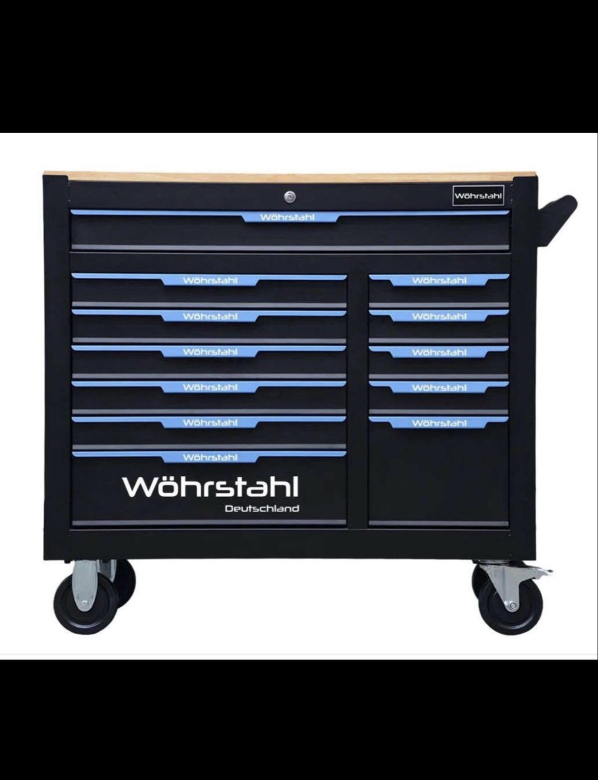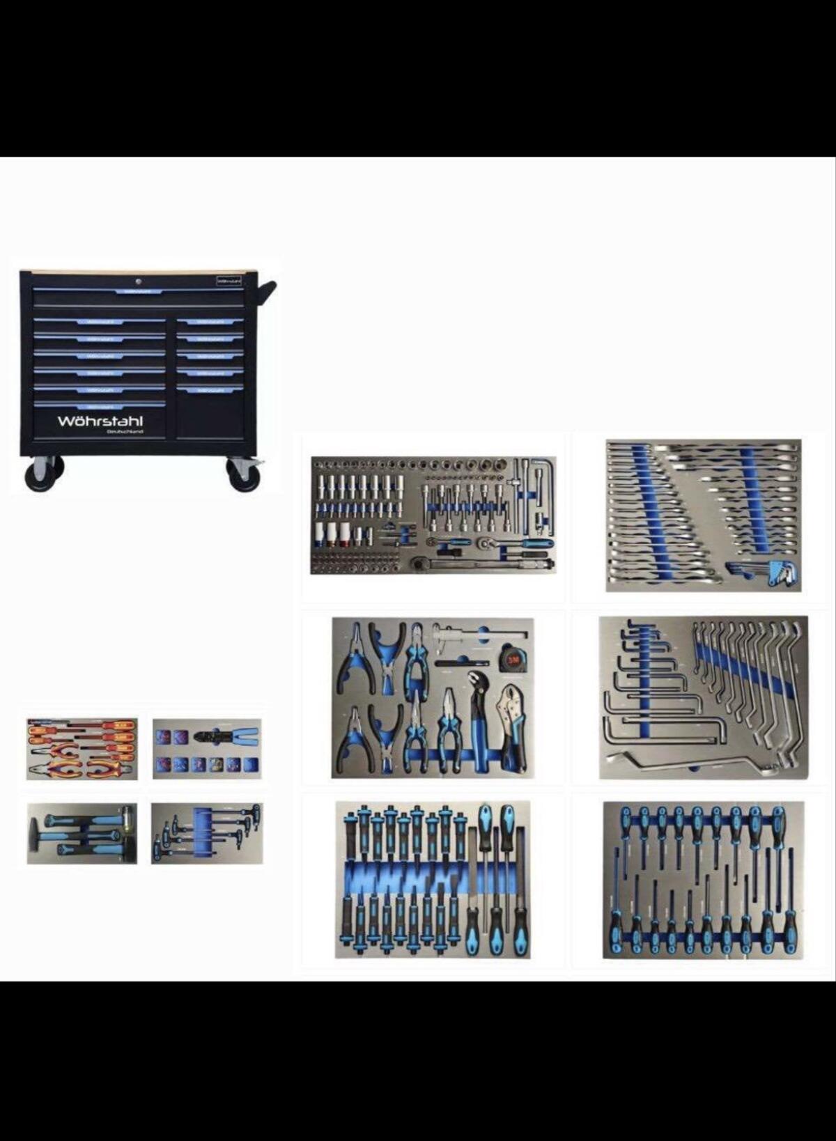 Professionelles Werkzeugmöbel auf Rädern – robust, organisiert und bereit für jede Werkstatt. Vollständig geschweißter Stahlrahmen mit Pulverbeschichtung für dauerhaften Schutz. 12 Schubladen – 10 mit hochwertigen Sets bestückt, 2 frei für persönliche Werkzeuge. Industrielles Chrom-Vanadium-Werkzeug (z. B. Schlüssel, Steckschlüssel, Schraubendreher, T-Griffe). Maße ca. 100 × 115 × 47 cm – solide Konstruktion, Gewicht ca. 116 kg. Stahlräder mit Bremse für Mobilität und Stabilität. Zentrale Verriegelung aller Schubladen für Sicherheit und Übersicht.