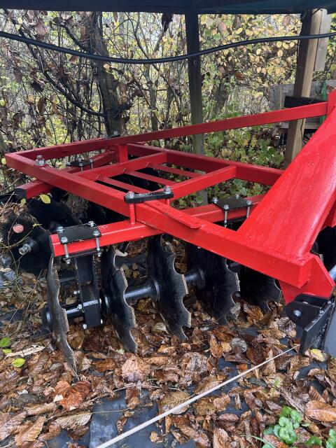 Die Scheibenegge ist 1, 60 m breit und wurde nur einmal gebraucht. Der Anstellwinkel kann bei beiden Walzen verstellt werden. Durchmesser der Scheiben: 510 mm. Die Sc