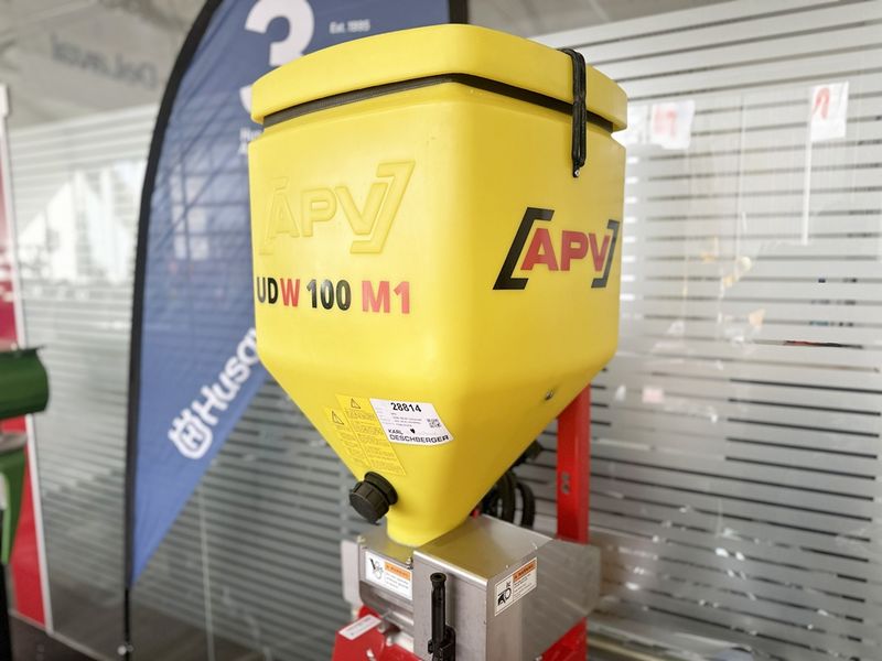 APV UDW 100 M1 Universaldosierer zum Streuen von trockenem Salz, kleinkörnigem Splitt (Korngröße 2/4) oder Mischungen daraus, kleine bis große Mengen exakt dosierbar mittels Flex-Säwelle mit 80 mm Durchmesser, zwangsangetriebenes Rührwerk, einfache Abdrehprobe (bei stehendem und weggeklapptem Teller), Ausbringung von korrosivem Streugut (Dünger) ist möglich, Kunststoffbehälter 102 l (ca. 120 kg Salz), Arbeitsbreite ca. 1 - 6 m, Rahmen mit KTL-Beschichtung (üblich in Automobilindustrie), komplette Dosiereinheit aus Edelstahl, komplette Maschine mit elektrisch angetriebener Streuscheibe mit 4 verstellbaren Wurfschaufeln und elektrisch geregelter Säwelle, 1 Deflektor, Oberlenkeranbau, Kontraplatte, Abdrehsack, 3-m-Kabel zur Stromversorgung von der Batterie zum 3-poligen Stecker und 1,5-m-Kabel vom 3-poligen Stecker zum Steuermodul und 6-m-Kabel vom Streugerät zum Steuermodul und Steuermodul 1.2