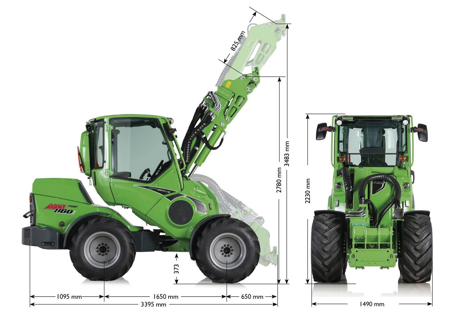 • Erweiterte Leistung: Mit einer Hubhöhe von bis zu 3500 mm und einer maximalen Hubkraft von 1,9 Tonnen setzt der 860i neue Maßstäbe in Bezug auf die Leistungsfähigkeit von Kompaktladern.