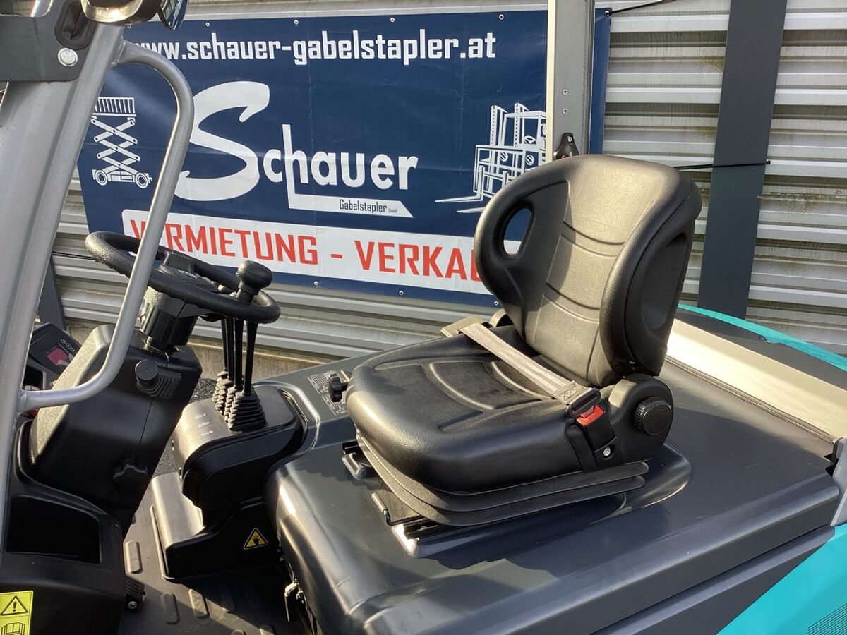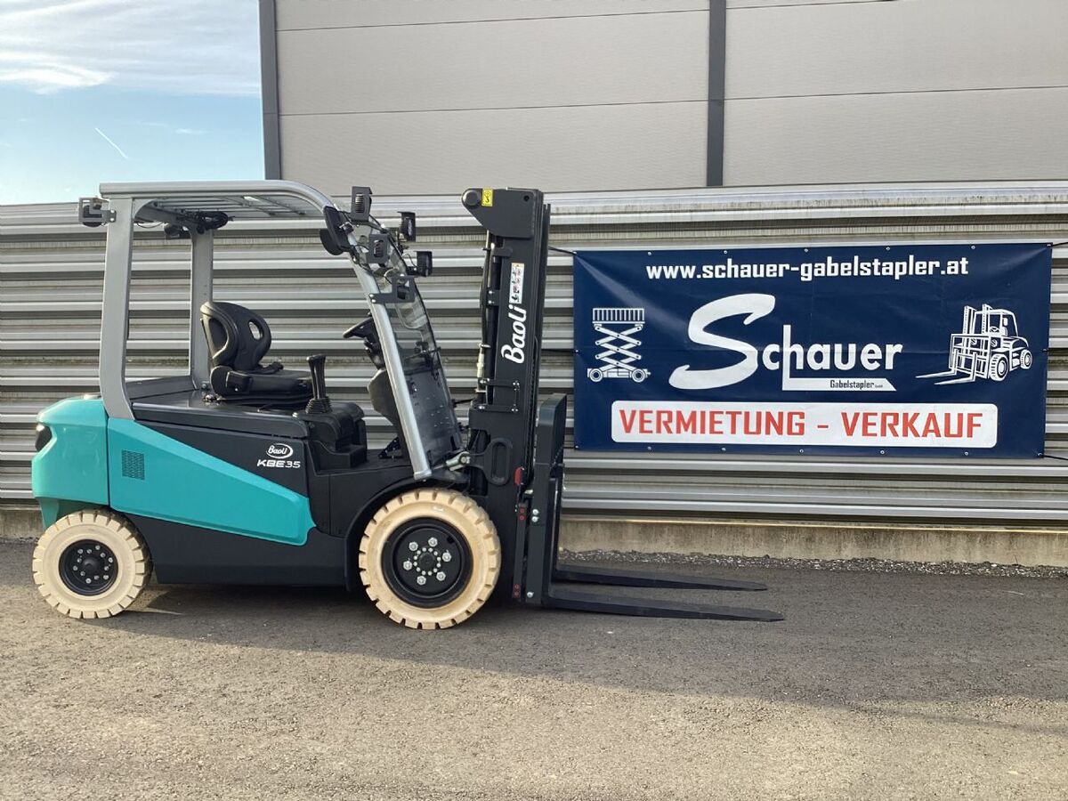 Bauart: Frontstapler / Elektro 4 Rad-Stapler, Tragkraft: 3500kg, Hubhöhe: 4650mm, Bauhöhe: 2212mm, Freihub: 1615mm, Gabellänge: 1200mm, Batterie: 80V 600Ah Zustand: Neu, Bereifung vorne: Superelastik , Bereifung hinten: Superelastik , Anbaugeräte: Seitenschieber, Anbaugerätebeschreibung: Vorgehängter Seitenschieber 3-3,5t 1100mm Sonderausstattung: Halbkabine, Sonderausstattungbeschreibung: Komfortsitz + ISO Sicherheitsventil 3691 Dachscheibe Glas USB Ladegerät Panormaspiegel Warnleuchte: Blitzleuchte unter dem Dach, geschützt Arbeitsscheinwerfer hinten: LED-Ausführung am Schutzdach oben rechts, geschützt Beleuchtungsanlage: LED-Ausführung vorn: 2 geschützte LED-Scheinwerfer mit Fahrtrichtungsanzeiger hinten: LED-Schluss- und Bremsleuchten, Fahrtrichtungsanzeiger, Warnblinkanlage Arbeitsscheinwerfer vorn: LED am Schutzdach, oben links und rechts, geschützt Warneinrichtung: akustischer Signalgeber Warnzonenleuchten: Safety Zone Light. Seitliche Warnlichter projezieren blaue Lichtbalken
