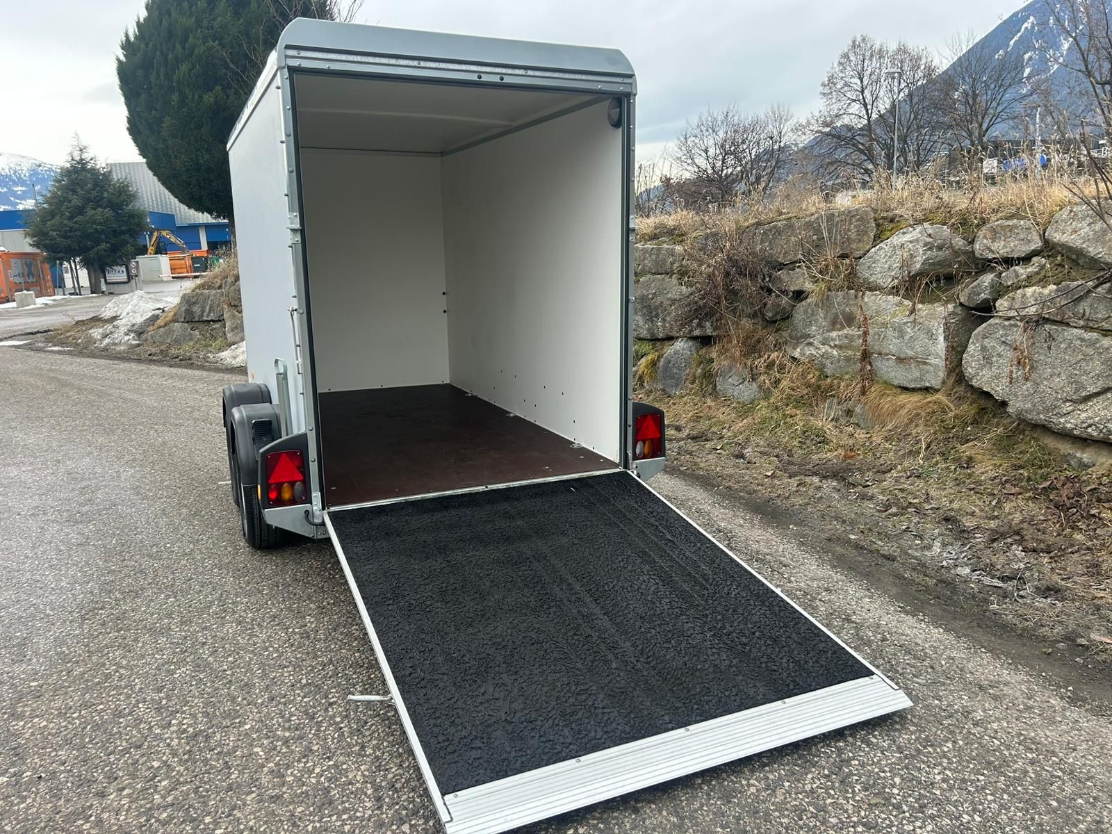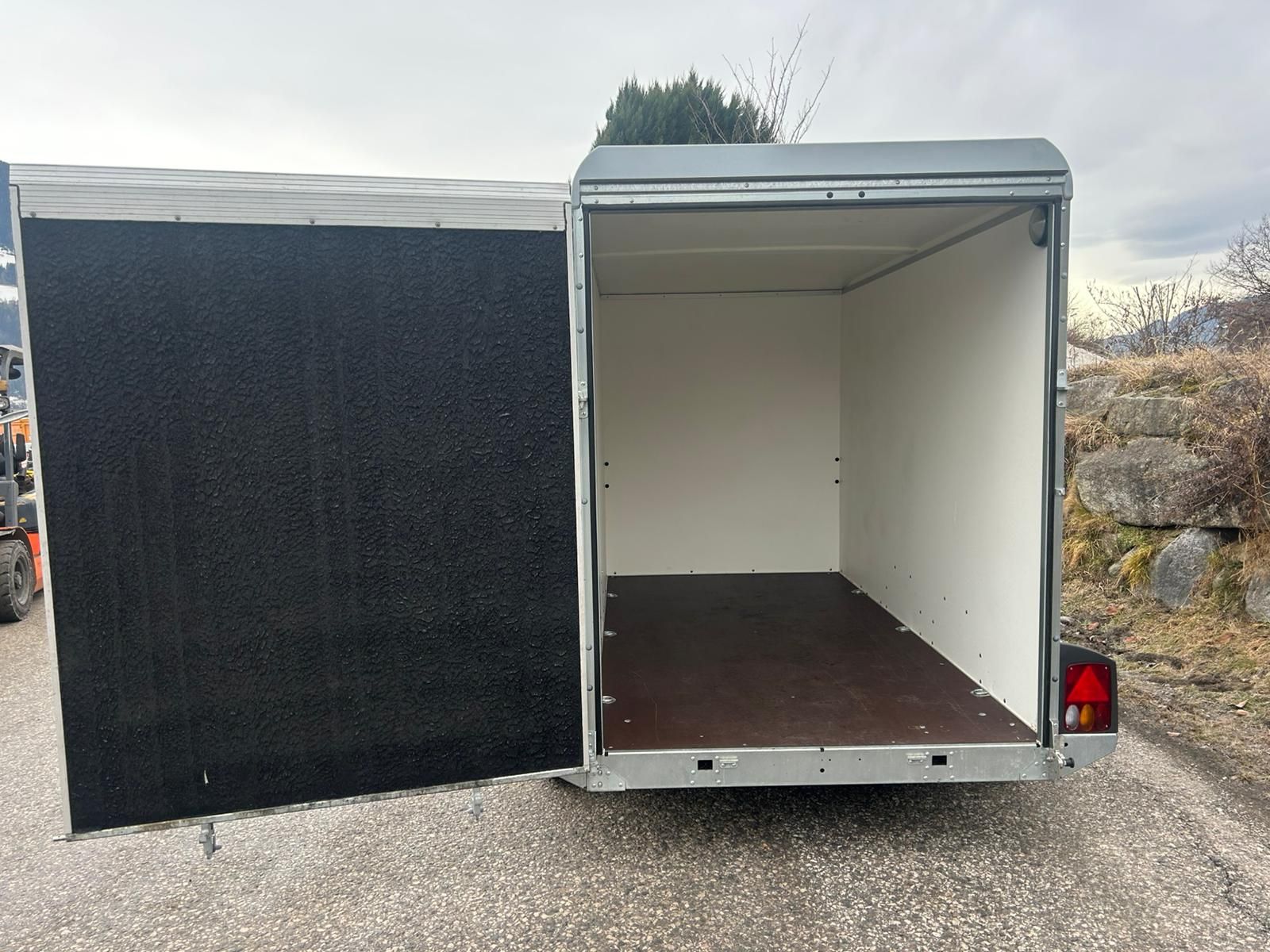 Kofferanhänger gebremst KT 3015/27 M F Innenmaße : 3015,00x1500,00x1820,00 mm Zulässiges Gesamtgewicht 2700kg Bereifung: 195 / 70 R 14 Felge: 5 1/2 J x 14 ET 30 Erstzulassung: März 2023 Pickerl gelocht 03/26 Stützrad automatik Bordwände außen grau/innen weiß 6 Zurringe auf Boden montiert (250 daN) Drehstangenverschluß Innenbeleuchtung Zweiachs-Modell 3 Querträger V-Deichsel +Tür-Rampenkombination +Silikonbeschichtung auf Auffahrrampe +Schiebestützen hinten +Bordwände außen grau/innen weiß +Fahrzeugpapiere Neupreis: 7500,00€ inkl. USt.
