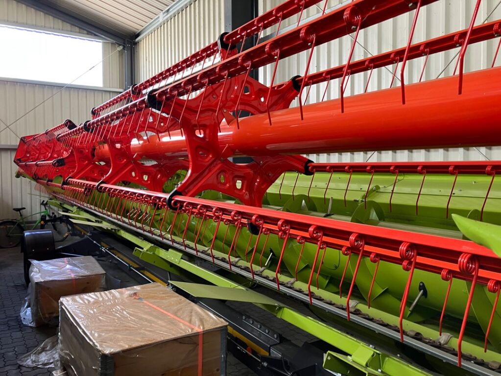 Maschine steht in einer Halle Ausstattung VARIO 1080: Rapstrennmesser, links Rapstrennmesser, rechts und Transportbox Haspel Stahlzinken Halmteiler kurz, einstell- und klappbar Schneidwerk auf Transportwagen aufgelegt Steinabweisblech 10,80 m Gesetzmäßige Ausrüstung, Standard Ausstattung Transportwagen, 52108545, Baujahr 2021: Zugdeichsel lang mit Bremse Auflaufbremse max. 40 km/h