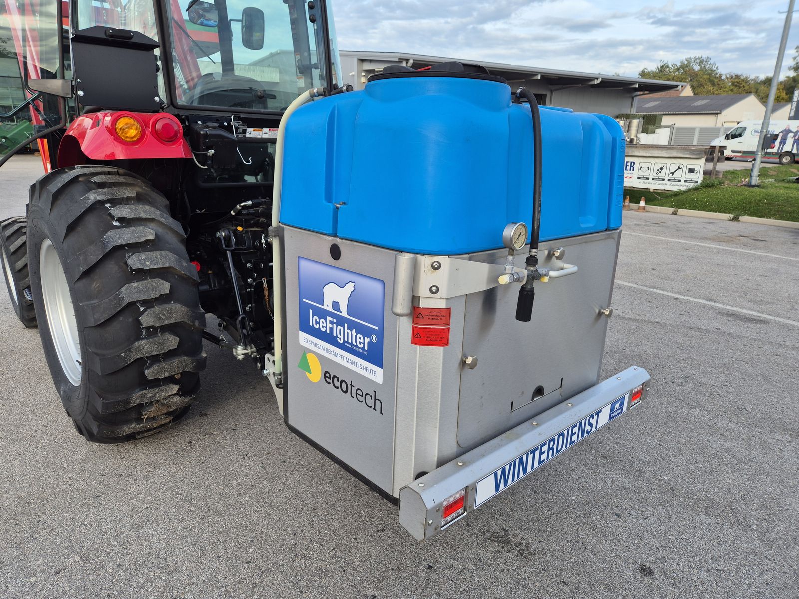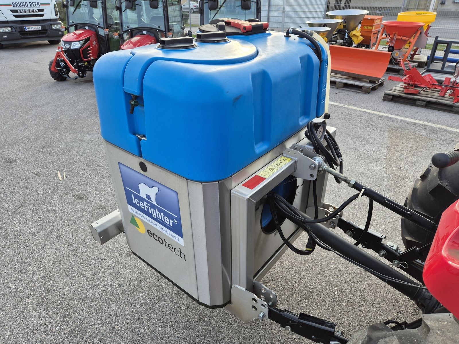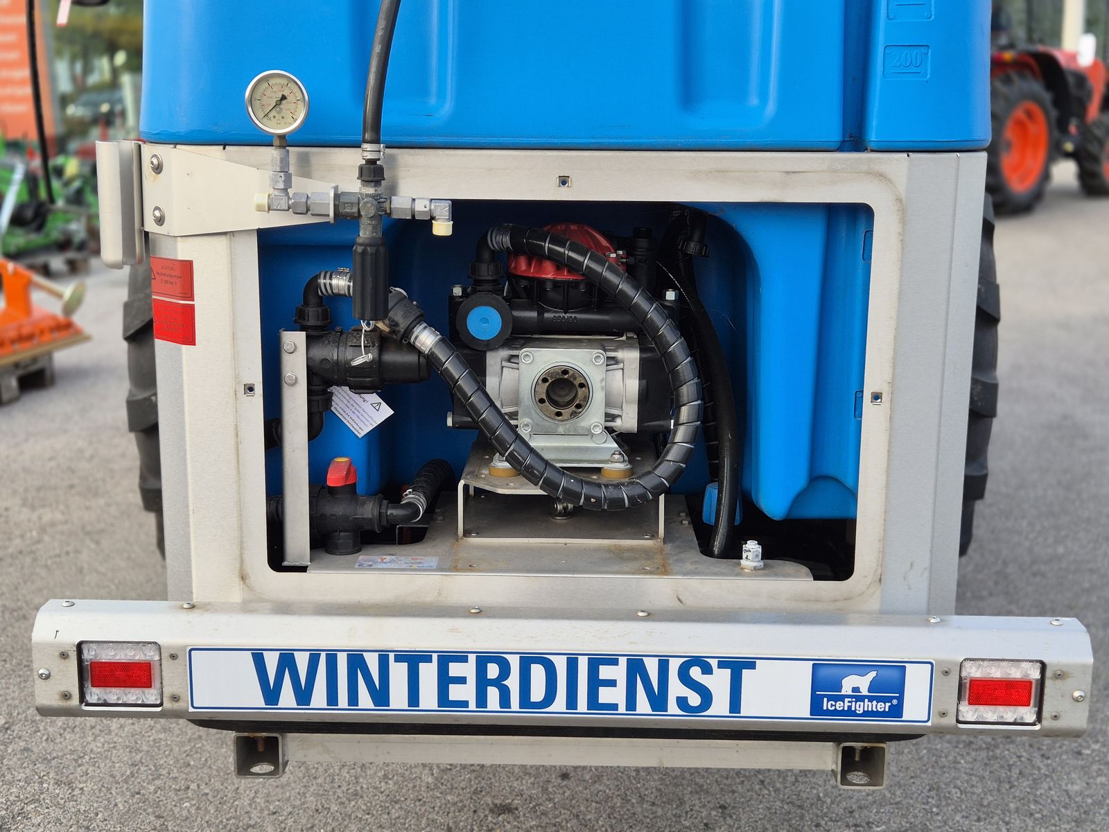 Bis zu 75% Streumittel sparen, Feinstaub und Streuschäden verringern - mit dem EcoTech IceFighter. Mit entsprechendem Zubehör auch zum ganzjährigen Einsatz geeignet - z.B. als Gießfass und/oder Hochdruck-Wascheinheit. 300 l Fassungsvermögen, 3-Punkt-Anbau KAT 1, robuster Edelstahlrahmen, Tank aus Spezialkunststoff, trockenlaufsichere und solefeste Kolbenmembranpumpe, Vorfilter, Manometer, elektrisch schaltbares Abschaltventil, Proportional-Regelventil mit Steuerungscomputer für wegabhängige Ausbringung in Abhängigkeit von Fahrgeschwindigkeit und Sprühbreite, 3-Zonen-Sprühbalken aus Edelstahl, Sprühbreite 120 - 240 cm, Düsenfilter, Gelenkwelle; Optional: - Handlanze mit Schlauchtrommel - Hochdruckpumpe (für Wechselbetrieb als Hochdruckreiniger)