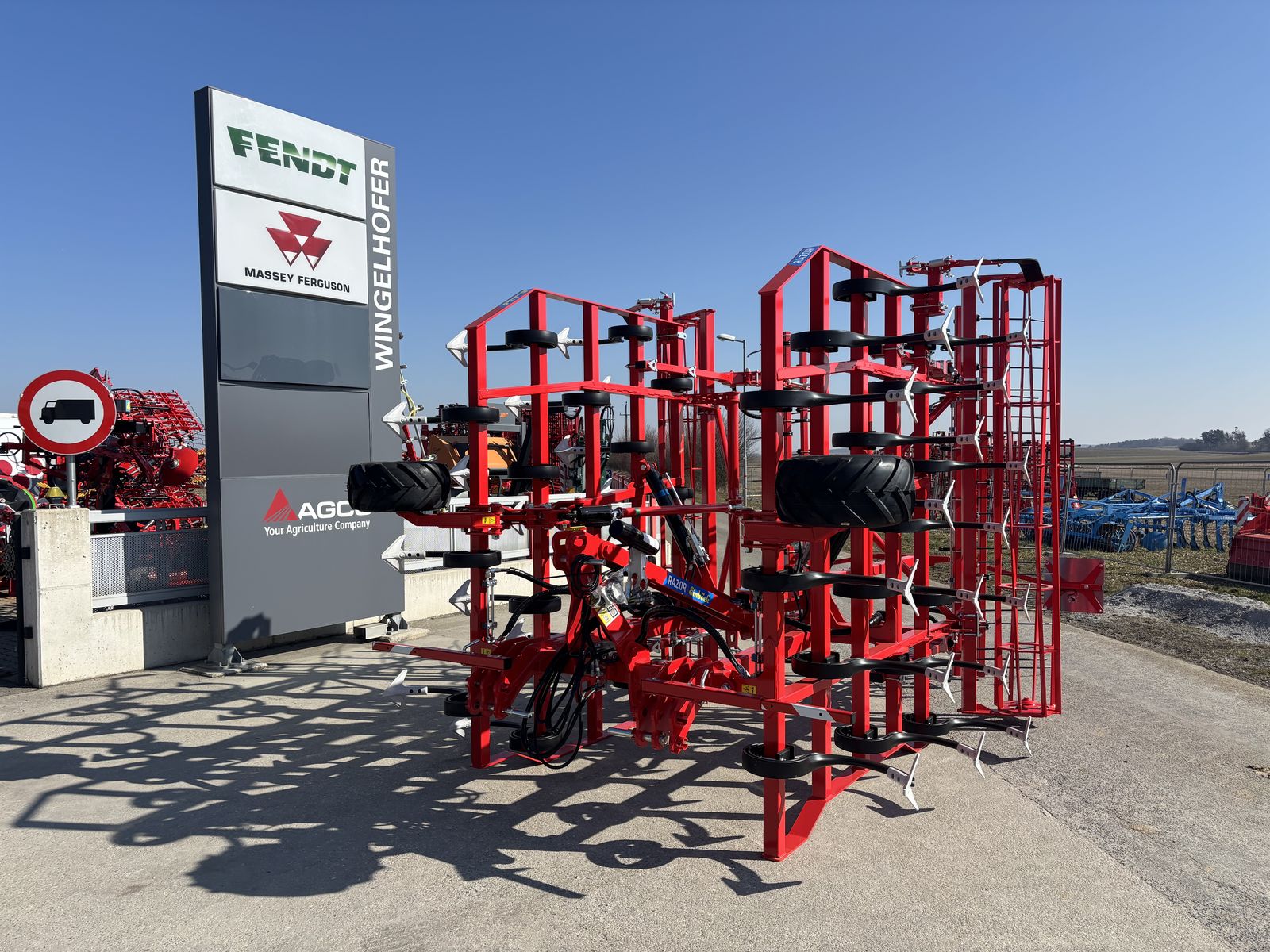 Grundrahmen mit hydraulischer H-Klappung mit zwei Zylinder (+1 DW) Nachläufer hydr. verstellbar (+1 DW) 5-balkige Rohr-in-Rohr Rahmenkonstruktion Strichabstand 15 cm (bei 34 Zinken); Balkenabstand 50 cm Arbeitsbreite: 5,10 m; Transportbreite: 2,93 m Anbaukategorie: II/ø28 & III/ø36 - Flachstabwalze 400mm - 34 stk. Herkules Zinken 70x12 mit innenliegender Verstärkungsfeder mit Keilführung - 34 stk. Hartmetall Gänsefußschare 220mm - Tasträder vorne mit Ackerstollenprofil 20x10.00-8 - Dreireihiger Nachlaufstriegel mit 12mm Zinken 12cm Strichabstand - Hydr. Verstellung des Eingriffswinkels des Striegels - Hydr. Verstellung des Nachlaufstriegel-Parallelogramms - Zustreicher links - Zustreicher rechts - Steuerventil elektrisch angesteuert für Razor fasst zwei doppeltwirkende Hydraulikanschlüsse zusammen (3pol. Steckdose erforderlich) - LED Beleuchtung & Warntafeln nach hinten