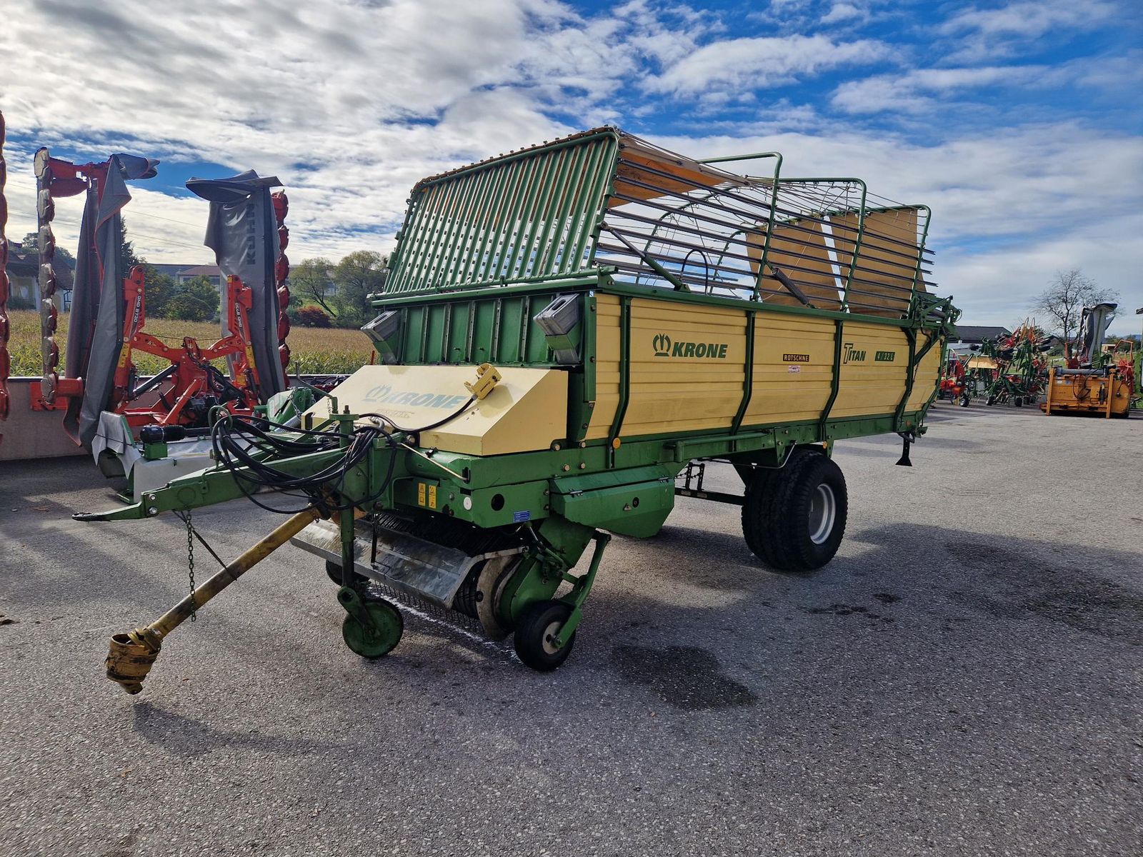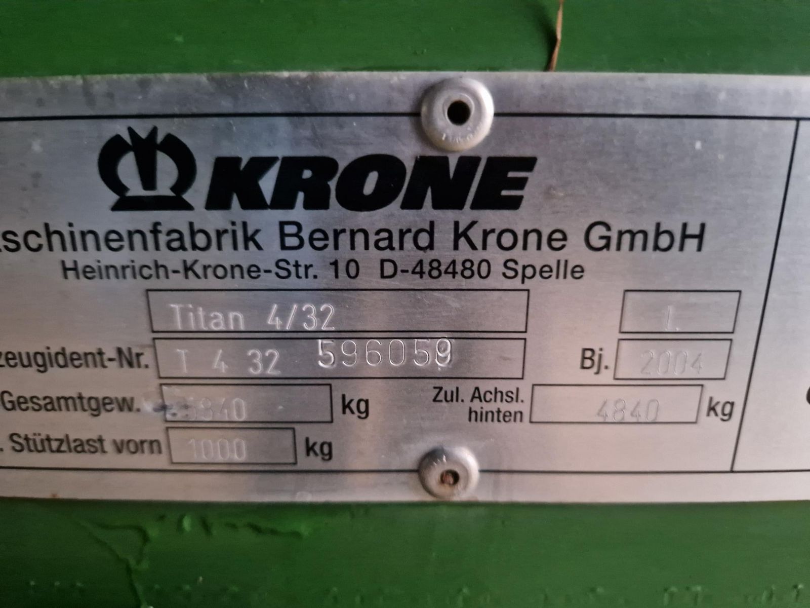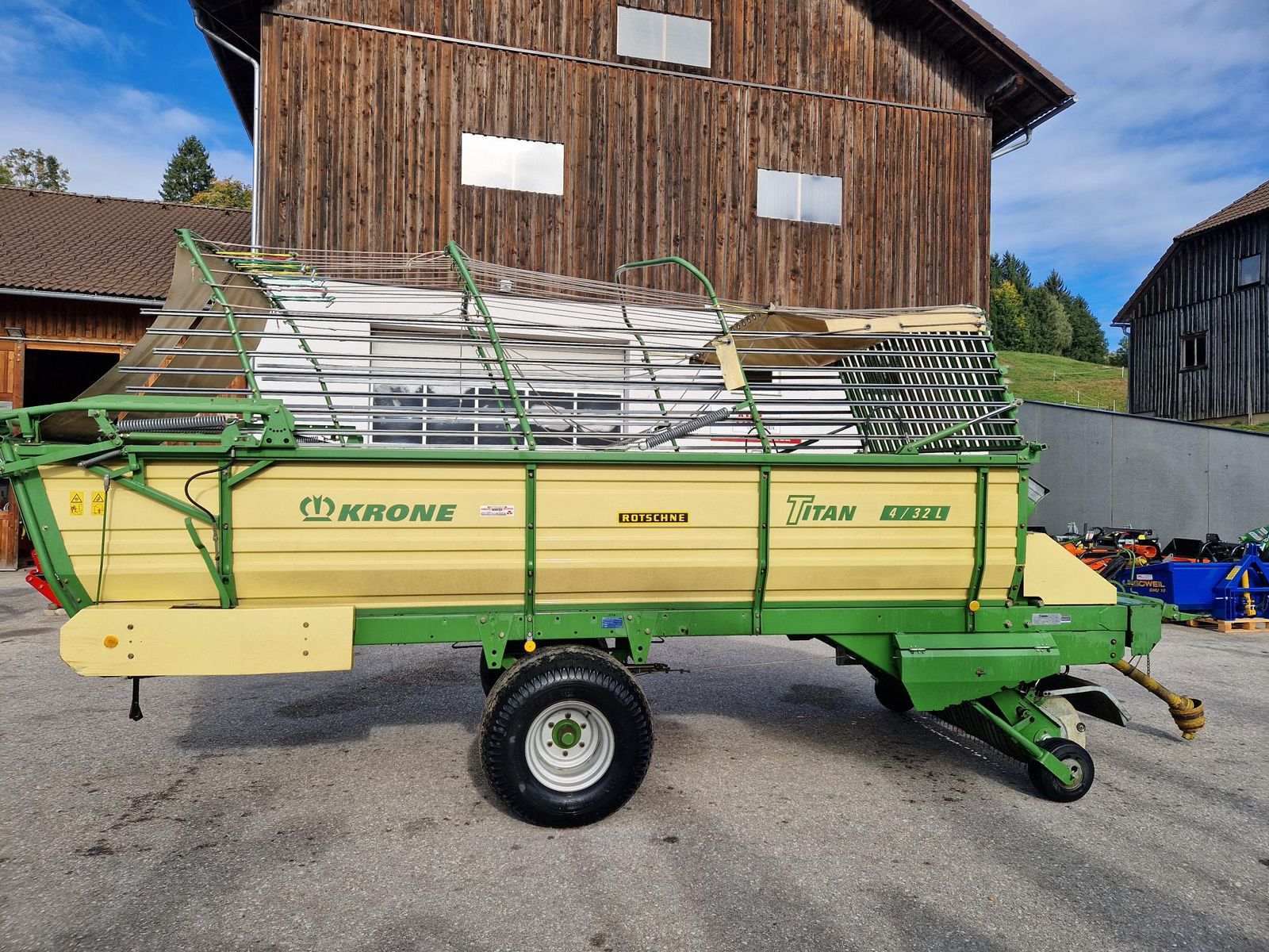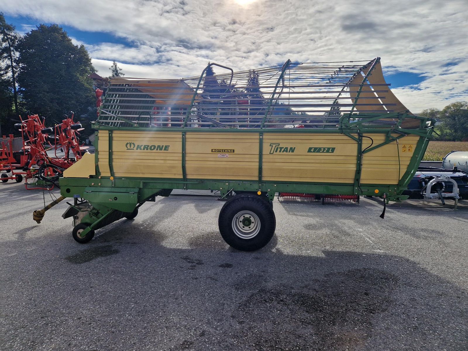 KRONE Kurzschnittladewagen TITAN 4/32 L, 32m³, 35 Messer Schneidwerk, Messergruppenschaltung, hydraulische Knickdeichsel, Dürrfutteraufbau hydraulisch klappbar, hydraulische Heckklappe, Kratzbodenantrieb hydraulisch mit zusätzlicher Bedienung am Heck, Pick Up hydraulisch mit zentraler Höhenverstellung und Prallblech, hydraulische Bremse, Bereifung 19/45-17, Beleuchtung.