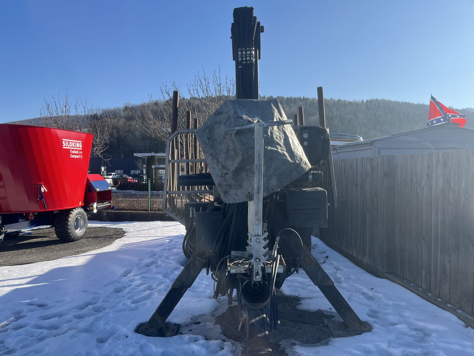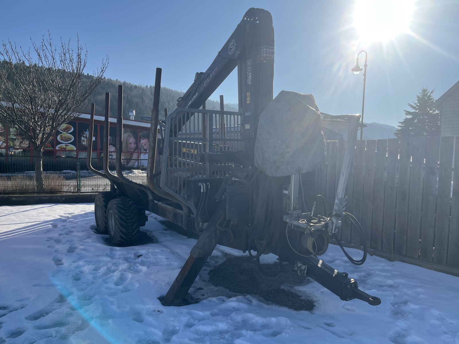 Palms Forstanhänger, BJ: 2016, hydr. Bremse, 4 Rungenpaare, Beleuchtung, Antrieb, Deichsellenkung, Forstkran 840, mechanische Drehhebelsteuerung, Stehpodest, Eigenölversorgung, A-Abstützung, Deichsellenkung, Forstzange 1,40 m, Gelenkwelle, Bereifung: 400/60-15.5, Standort: RLH Hofstetten, Ansprechpartner: Andreas Diry