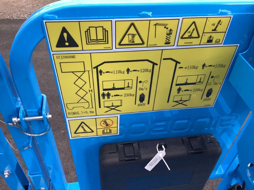 Bauart: Arbeitsbühnen / Scherenarbeitsbühne, Tragkraft: 230kg, Hubhöhe: 5800mm, Bauhöhe: 2140mm, Batterie: 24V 225Ah Zustand: Neu, Bereifung vorne: Bandagen Einfach 80 - 100% , Bereifung hinten: Bandagen Einfach 80 - 100% , Sonderausstattung: CE Zertifikat, Safety Light,