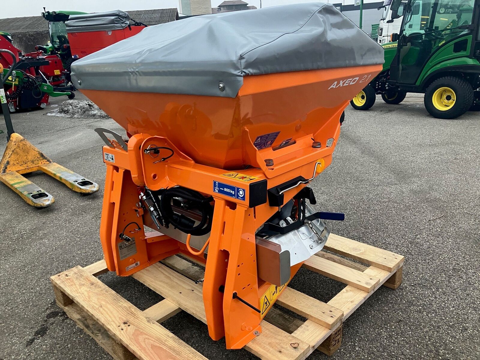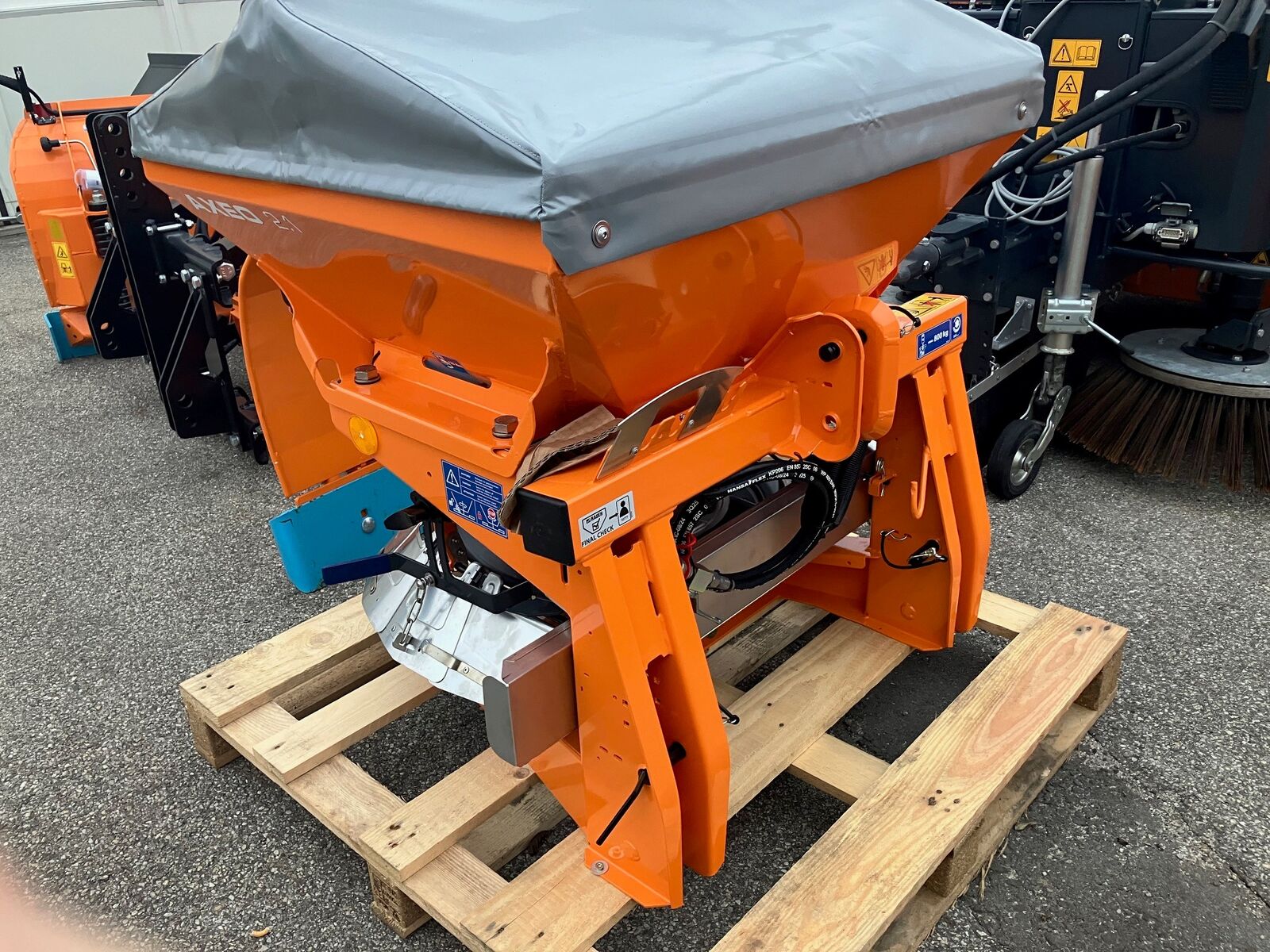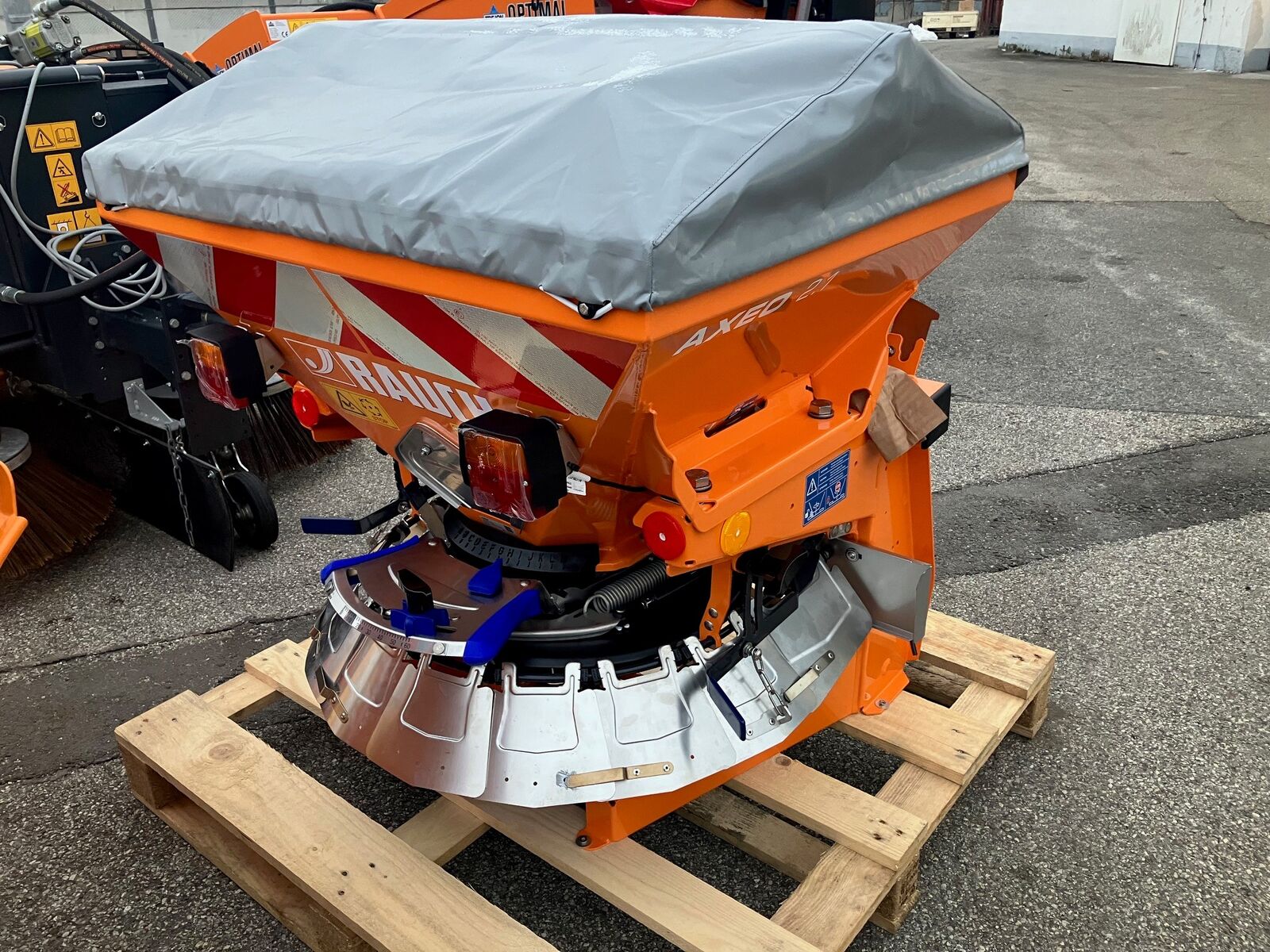Klassifizierung: Neumaschine; Weitere Maschinenmerkmale: - Antrieb über Gelenkwelle - Schutzgitter im Behälter - CDA-Streutechnik mit drehbarem Behälterboden - Streubreitenbegrenzung manuell rechts/links verstellbar von ca. 1 m – 8,0 m - Halbseitenschieber auch zum einseitigen Streuen nach links - Behälterboden, Dosierschieber, Streuscheibe, Streubreitenbegrenzung und Wurfflügel aus Edelstahl - Reflektierende Warnfolie für erhöhte Verkehrssicherheit - Beleuchtung BLO 18 - Abdeckplane - hydraulische Schieberbetätigung - Salzrührwerk