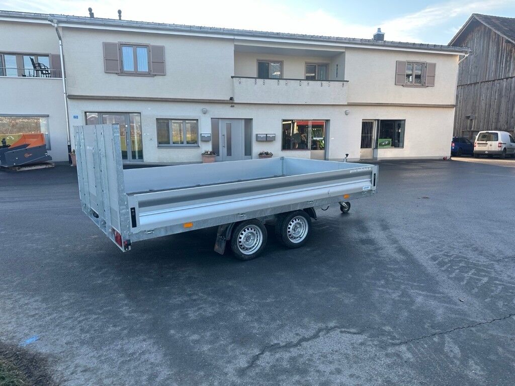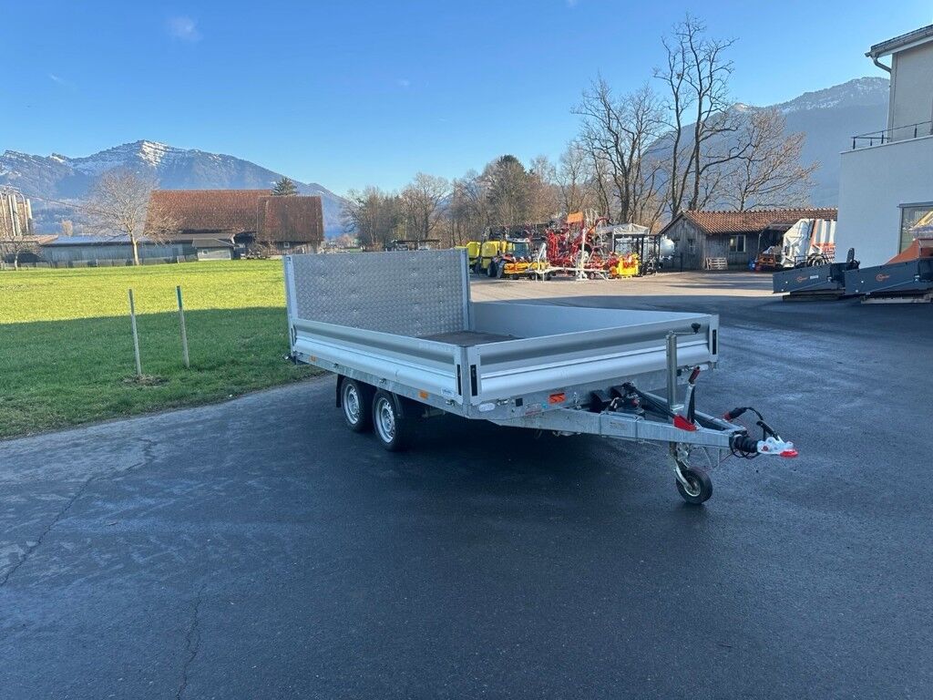 Transportanhänger Vezeko Hochlader Typ Jumbo 27.3Gesamtgewicht 2700kgBrücke mit manueller Hydraulikpumpe kippbarAuffahrrampen hinten 100cm, mit Riffelblech belegtBrückenmass Länge 360cm x Breite 218cmFrisch ab Kontrolle, Nutzlast 2019kgAlu Bordwände 35cmSehr wenig gebraucht, Gewicht:681