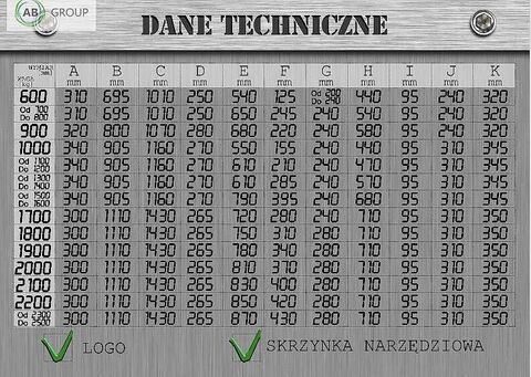 patrz: zdjęcie): - A 310 mm - B 695 mm - C - 1010 mm - D 250 mm - E 540 mm - F 125 mm - G od 200 do 240 mm - H 440 mm - I 95 mm - J 240 mm - K 320 mm