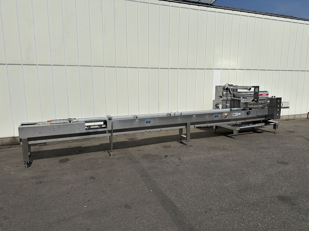 Die Record Panda BS RS Medium Flowpack-Maschine (Unterversiegelung) ist eine vielseitige horizontale Flowpack-Anlage, ausgelegt für das effiziente Verpacken verschiedenster Produkte in der Lebensmittel- und Non-Food-Industrie. Diese Maschine eignet sich besonders zum Verpacken mit und ohne Trays: Frische Produkte wie Obst und Gemüse Backwaren (Brot, Kekse, Gebäck) Molkereiprodukte Fleisch und GeflügelDiese Maschine wurde zum Flowpacken von Tomaten mit und ohne Tray eingesetzt. Das Verpacken von 4-6 losen Tomaten ohne Tray ist nur unter den richtigen Bedingungen möglich, z. B. gleiche Größe und geeignete Folienart usw. Record Panda BS RS Flowpack-Maschine Transportband mit Mitnehmer oberhalb der Siegelrollen (auch für lose Produkte geeignet) Einlaufkette mit Produktträgern und Schiebern Zuführkette 570 cm ServomotorenWeitere Informationen oder eine vollständige Angebot? Fragen Sie das einfach und schnell an auf unsere Duijndam Machines Website! Sie können uns auch anrufen.Alle zuverlässigen Maschinen finden Sie auf unserer Website.Seit 40 Jahren zuverlässiger Händler von gebrauchten Landwirtschafts- und GartenbaumaschinenDie Maschinen werden vor Auslieferung geprüftErfahrenes TeamWir können Ihnen helfen, die Maschine zu Ihrem Unternehmen zu TransportierenDuijndam MachinesDer Spezialist in Gebrauchtmaschinen für Landwirtschaft und Gartenbau