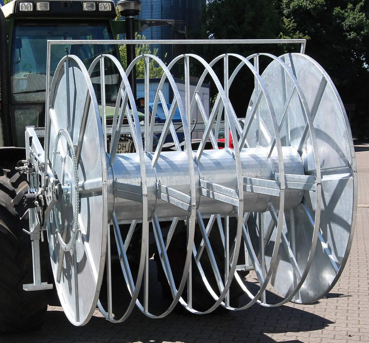 Preis nur gültig für lagernde Maschinen. - Schlauchhaspel für Flachschläuche mit hydraulischen Antrieb - Rahmen und Trommel feuerverzinkt, sehr stabile Ausführung - Antrieb über Schlepperhydraulik - Trommel schnell auswechselbar mit geringem Aufwand - Durchgehende Aussparung am Trommelkern für Storz- und Bauer-Kupplung - Freilauf zum Abwickeln - Sicherheitsbügel für Antrieb-Abschaltung - Bis 8 Abteilungen möglich (Im Preis nicht enthalten, Aufpreis pro Stück 354€ inkl. MwSt.) - Flachschlauch 102mm max. 720m möglich zum Aufwickeln