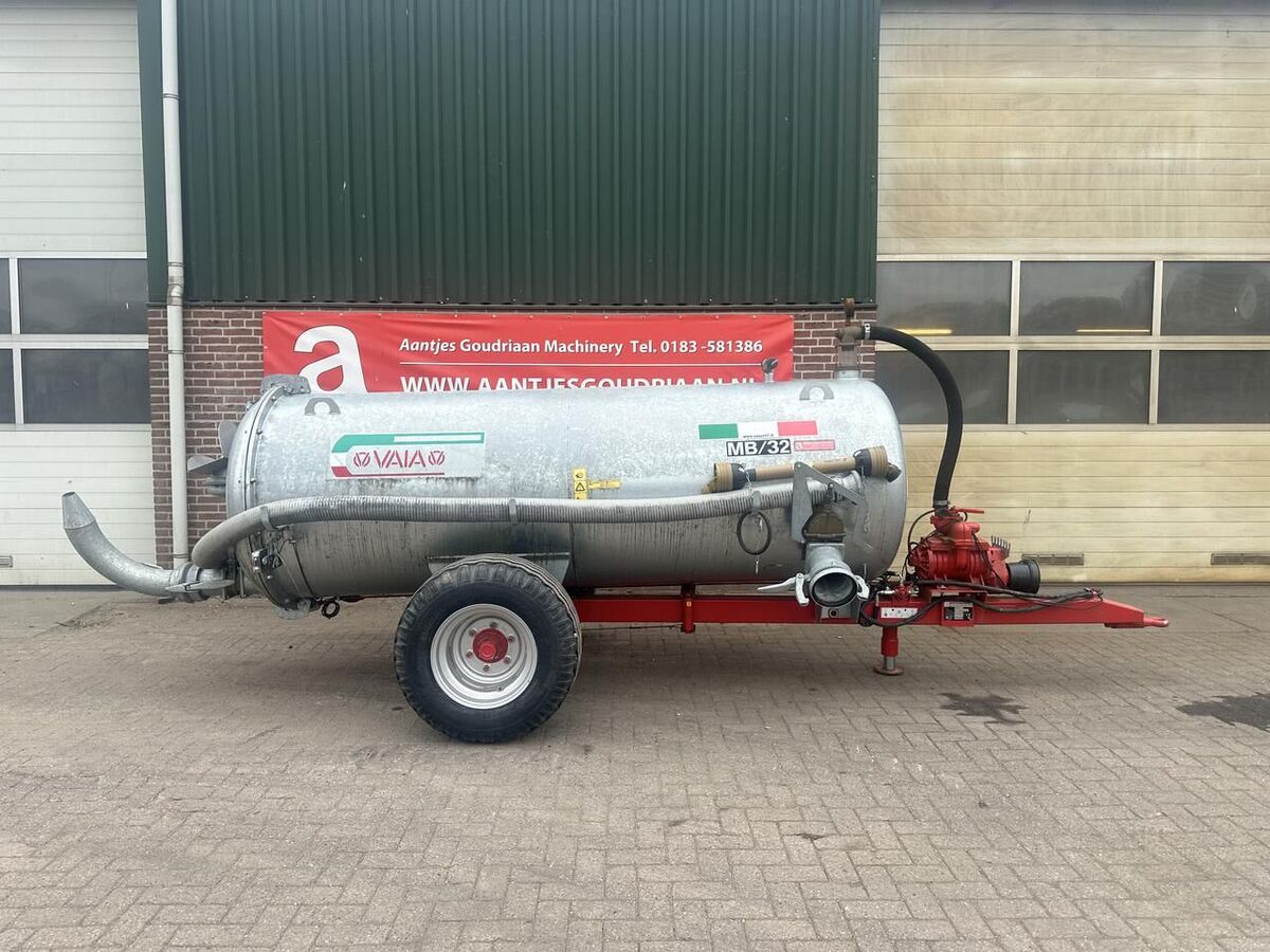 == Overige details (NL) == Vaia waterwagen MB32 • Draaibaar trekoog • Hydraulische steunpoot • Zij aansluiting rechts • Banden 15/75/15 • Gegalvaniseerde tank • 6" Perrot aansluitingen • Tank inhoud 3200 Liter • Pomp capaciteit 4000 Liter/min. • Tank diameter 1100 mm • Totale lengte 5300 mm • Totale hoogte 2000 mm • Asdikte 60 mm • Remtrommel 300x60 • Compleet met zuigslang, aftakas en sproeistukken • Incl kenteken Staat: Gebruikt Bouwjaar: 2023