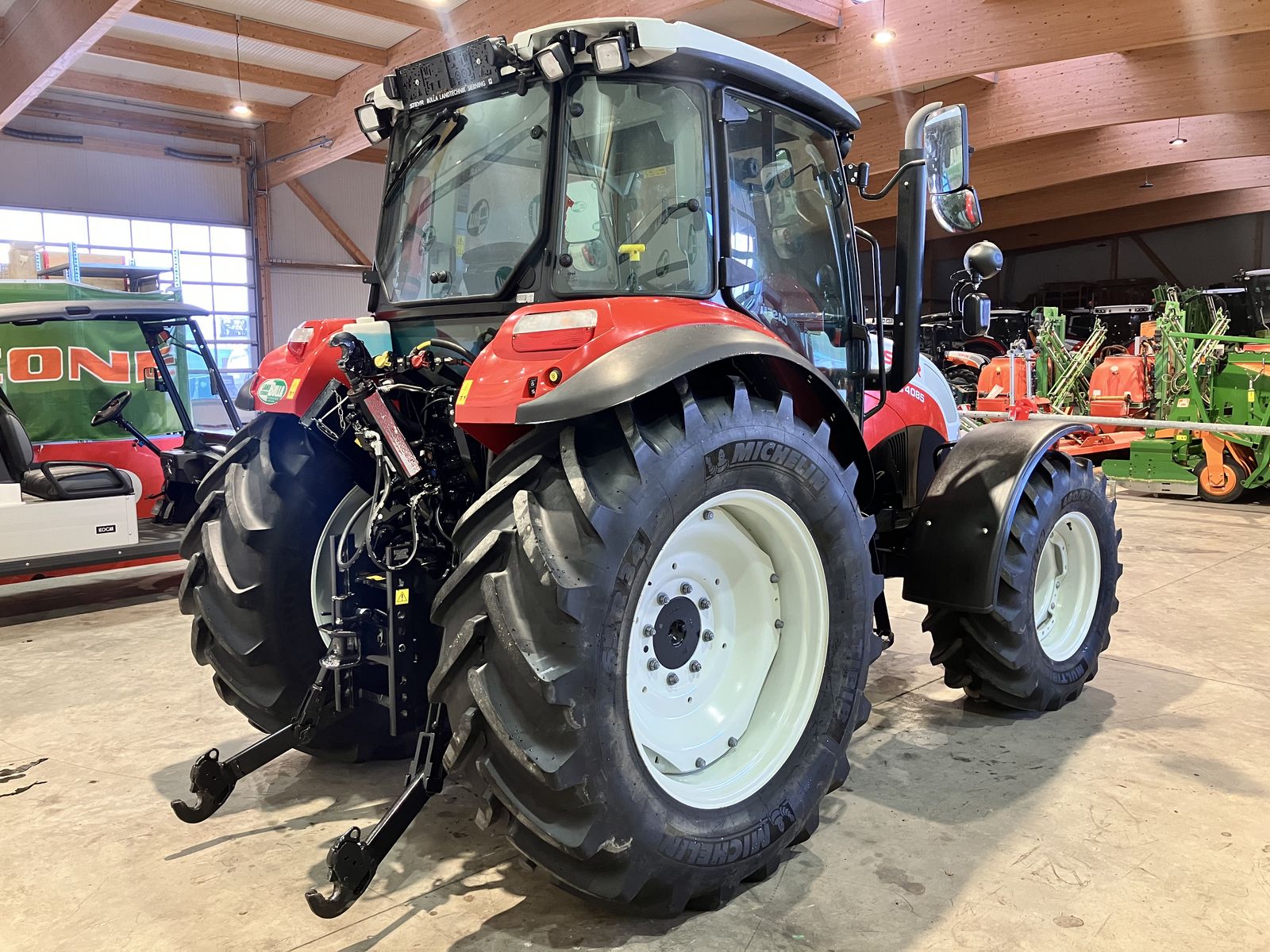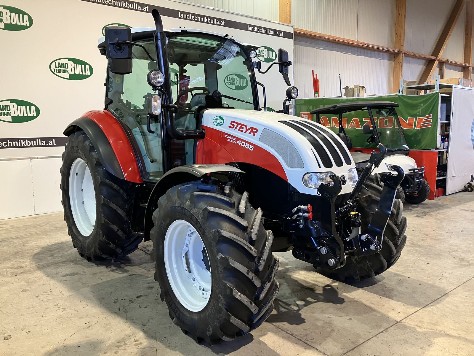 STEYR Kompakt 4085 + Bj. 2021, 820 h + 24/24 Gang Getriebe mit Power Shuttle und Lastschaltung + 40 km/h ECO Getriebe + Power Shuttle in 3 Stufen einstellbar + Bereifung: hinten 540/65 R 34 und vorne 440/65 R 24 Michelin + Ringverstellfelgen + Kotflügelverbreiterung hinten + 5x DW Zusatzsteuergeräte (3x DW Hecksteuergeräte und 2x DW mit original Kreuzhebel) + druckloser Rücklauf + EHR mit 2 Zusatzhubzylinder + hydraulischer Oberlenker + Hubwerk- und Zapfwellenaußentaster + 540/750/1000 - 3-fach Zapfwelle + Luftsitz mit Horizontalfederung + 2x Drehlichter + Fronthubwerk original + Frontelektrik + 2 Leitungen nach vorne + ausstellbare Frontscheibe + Klimaanlage + 2 Leiter Druckluftanlage + höhenverstellbare Anhängevorrichtung + Ersatzscheinwerfer + Multicontroller + Monitorhalterung rechts + Traktor in neuwertigen Zustand