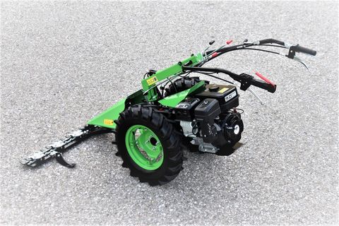 Honda GP200 mit 6 PS Getriebe aus Stahlguss mit 2 Vorwärts- und 2 Retourgängen Bereifung 4.00 - 8 Lenkholm 180 ° drehbar, höhen- und seitenverstellbar Exzenter-Mähantrieb mit 102 cm Finger- oder fingerloser Balken Optionen: Bodenfräse, Kehrmaschine, Schneeschild, Schneefräse, Sichelmulcher
