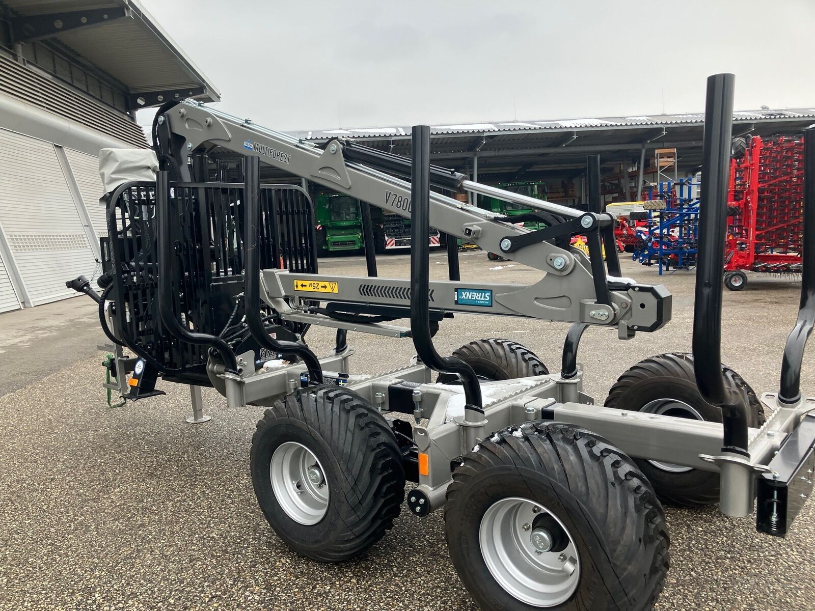 Klassifizierung: Neumaschine; zul. Gesamtgewicht (kg): 10500; Achsenzahl: 2; Laderaumbreite (cm): 206; Kran: Ja; Kranreichweite: 7800; Anzahl Teleskop: 1; Anzahl der Rungen: 4; Höchstgeschwindigkeit (km/h): 25; Typ der Anhängerbremse: Hydraulisch; Stehpodest: Ja; Eigenölversorgung: Ja; schwenkbare Deichsel: Ja; Beleuchtung: Ja; Greiferart: Holzzange; Pratzenabstützung: Ja; Weitere Maschinenmerkmale: Anhänger Rahmen mit 4 Rungenpaaren Teleskopstützbeinen Deichsel gekröpft mit Knicklenkung Bereifung 400/60-15,5 Hydr. Bremse Einklappbare Beleuchtung Kran V 7800 mit 7800mm Kranlänge, max Hubkraft: 1040kg auf 4,0m Kransteuerung mechanisch, 2XYZ Euro Drehhebelsteuerung Gelenk an Kranspitze mit Pendelbremse Rotator CR300, max. Belastung 30 kN Holzgreifer G120 Ausziehbare Rahmenverlängerung Eigenölversorgung
