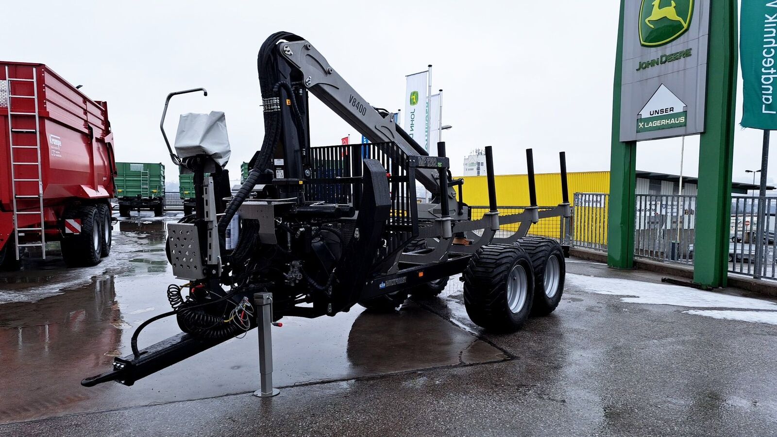 Klassifizierung: Neumaschine; Seriennummer/Fahrgestellnummer: 26961004; zul. Gesamtgewicht (kg): 12000; Stützlast: 2000; Achsenzahl: 2; Laderaumhöhe (cm): 130; Laderaumbreite (cm): 215; Laderaumlänge (cm): 410; Kran: Ja; Kranreichweite: 840; Hubkraft: 1510; Anzahl Teleskop: 2; Anzahl der Rungen: 4; Anhängeart: Anhängevorrichtung; Höchstgeschwindigkeit (km/h): 25; Typ der Anhängerbremse: Pneumatisch; Stehpodest: Ja; Eigenölversorgung: Ja; Joystick: Ja; minimale Aufbaulänge (in cm): 410; maximale Aufbaulänge (in cm): 410; schwenkbare Deichsel: Ja; Beleuchtung: Ja; Greiferart: Holzzange; Pratzenabstützung: Ja; Weitere Maschinenmerkmale: NEU - Forstanhänger Trejon Multiforest MF 1202 TEC mit Kran V 8400 4 Stk. Forwarder-Rungen Druckluftbremse auf 4 Räder Bereifung 550/45-22.5 Stehplattform proportionale Niederdruck-Joysticksteuerung Pendelbremse Flanschrotator 4t Greifer G130 - 130 cm Öffnungsweite - HARDOX einklappbare LED-Beleuchtung Zugöse DIN 40 optional mit Eigenölversorgung inkl. Gelenkwelle und Ölkühler