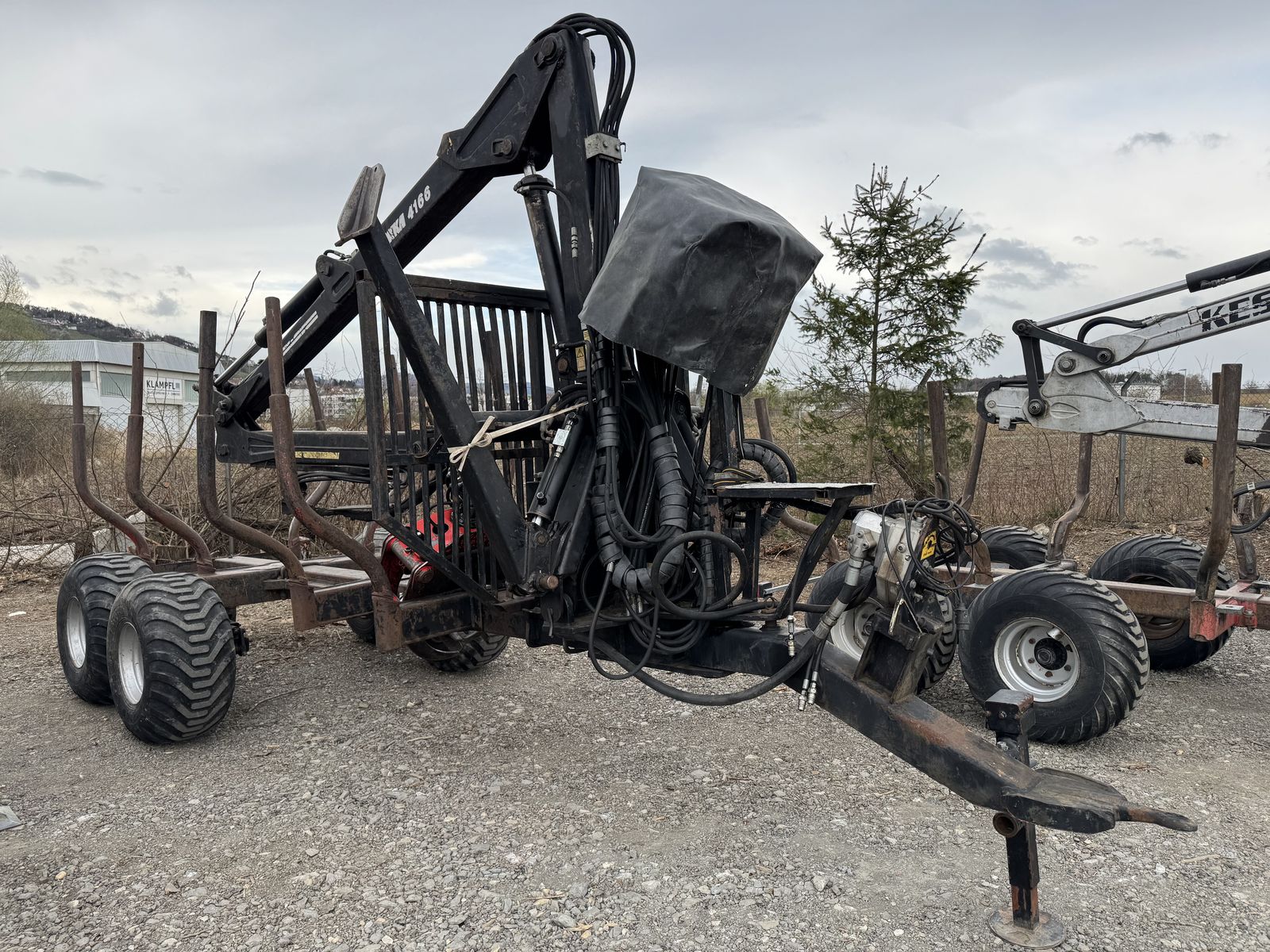 Nokka Forstanhänger MV 80 8 Tonnen Nutzlast Ausführung Doppelrahmen Mit Straßenbeleuchtung Mit vier Rungenpaaren Mit hydraulischer Bremse Kran 6, 4 Meter R