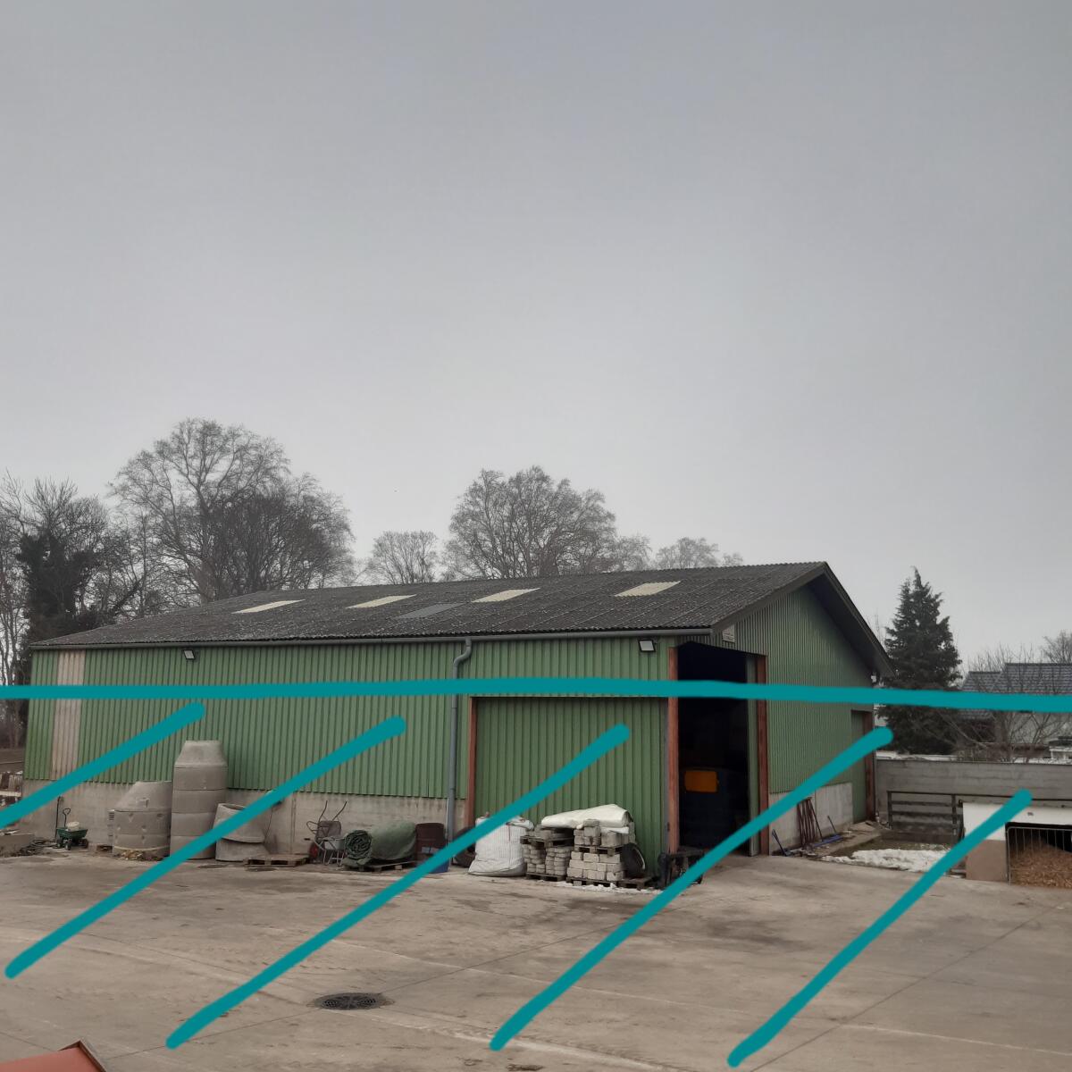 Wir verkaufen unsere Stallung zum Selbstabbau, NP € 14.377, 31, -, 8, 26 m x 6, 34 m, 4 Eingänge, Lichtplatten an der Rückwand, Dachüberstand von 1 m an der re. 6 m Seit