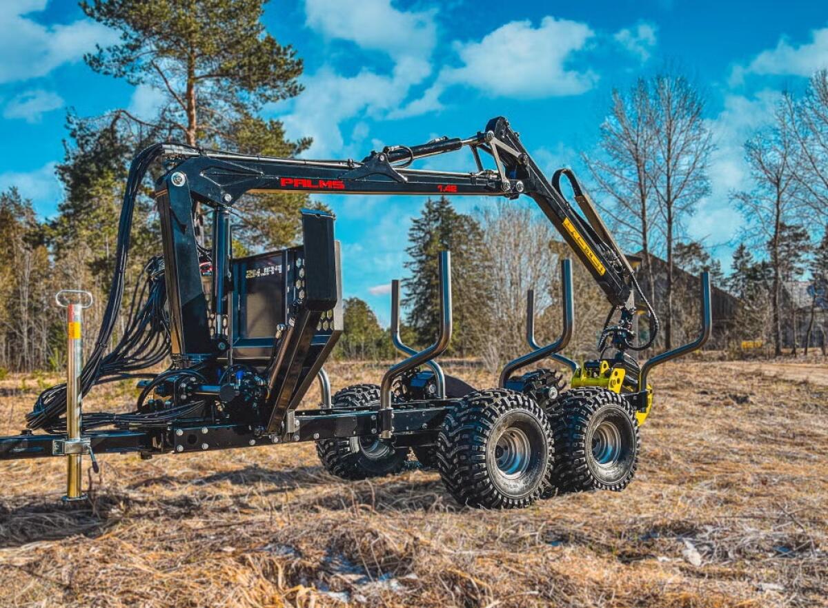 Zum Verkauf steht ein neuwertiger Palms 2D Holzanhänger, passend für ATVs oder kleine Traktoren. Er hat drei Pfahlpaare, einen Palms-Kran 1, 42 m mit Rotator-Holzkral