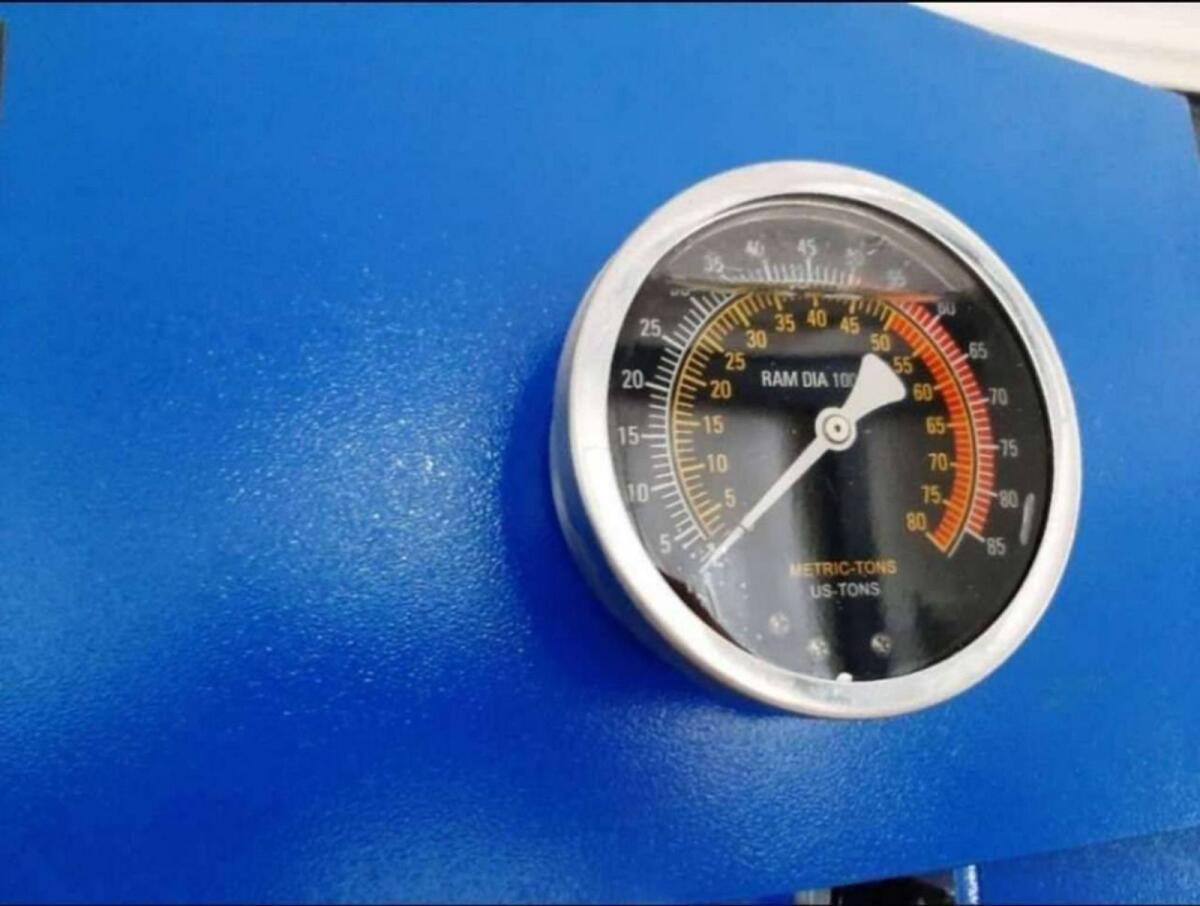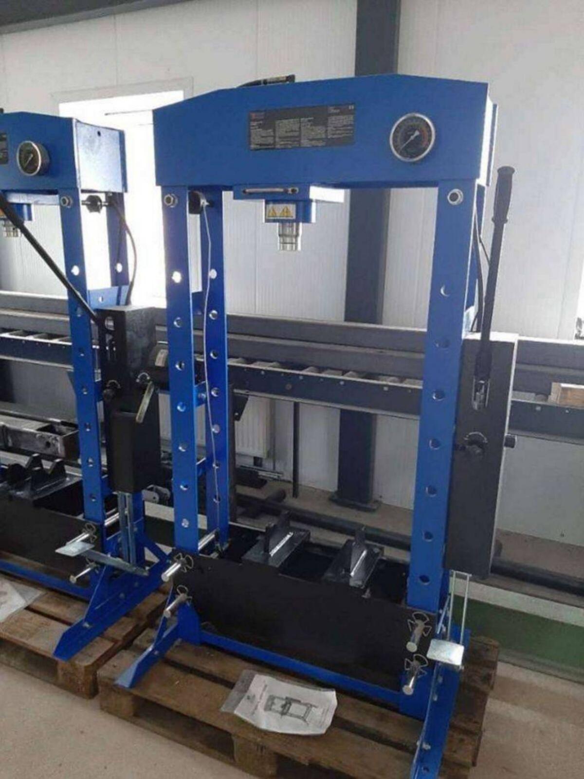 50 t Presse, Werkstattpresse WP50H mit Fußpedal 50 t, schwere Stahlkonstruktion, sehr stabil, Pressrahmen ist vollständig verschweißt, verschiebbarer Presszylinder, Manometer fest am Pressständer montiert, höhenverstellbarer Presstisch, Heben und Senken des Presstisches durch Seilwinde, zweistufige Hydraulikpumpe, schnelle und langsame Geschwindigkeit, robuster Pedalmechanismus, Fuß- und Handbetätigung, 4 Verriegelungsbolzen sorgen für Sicherheit. Technische Daten: Druckkraft 50 t, Kolbenhub 225 mm, Arbeitsbereich 55–1.065 mm, AB 730 mm, Säulentiefe 230 mm, Breite 1.270 mm, Tiefe 880 mm, Höhe 1.915 mm, Gewicht ca. 300 kg.