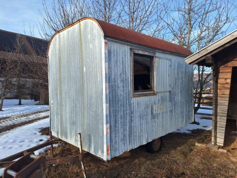 Anhänger mit Rungen zum Rundholztransport und Scheitholztransport, mit Zurrpunkten, Werkzeugkasten, Begrenzungslicht. Grundiert und lackiert, neue Bereifung. 30 mm Nut-Feder-Bretter.