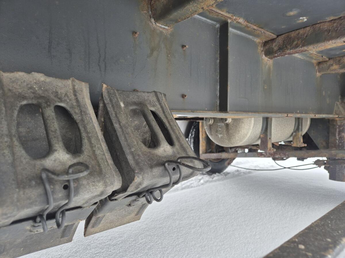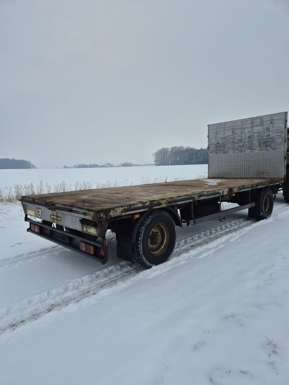 Massives Stahlplateau mit Zurrösen, Druckluftbremsanlage, ideal für Kisten und Ballentransport, niedrige Plateauhöhe.