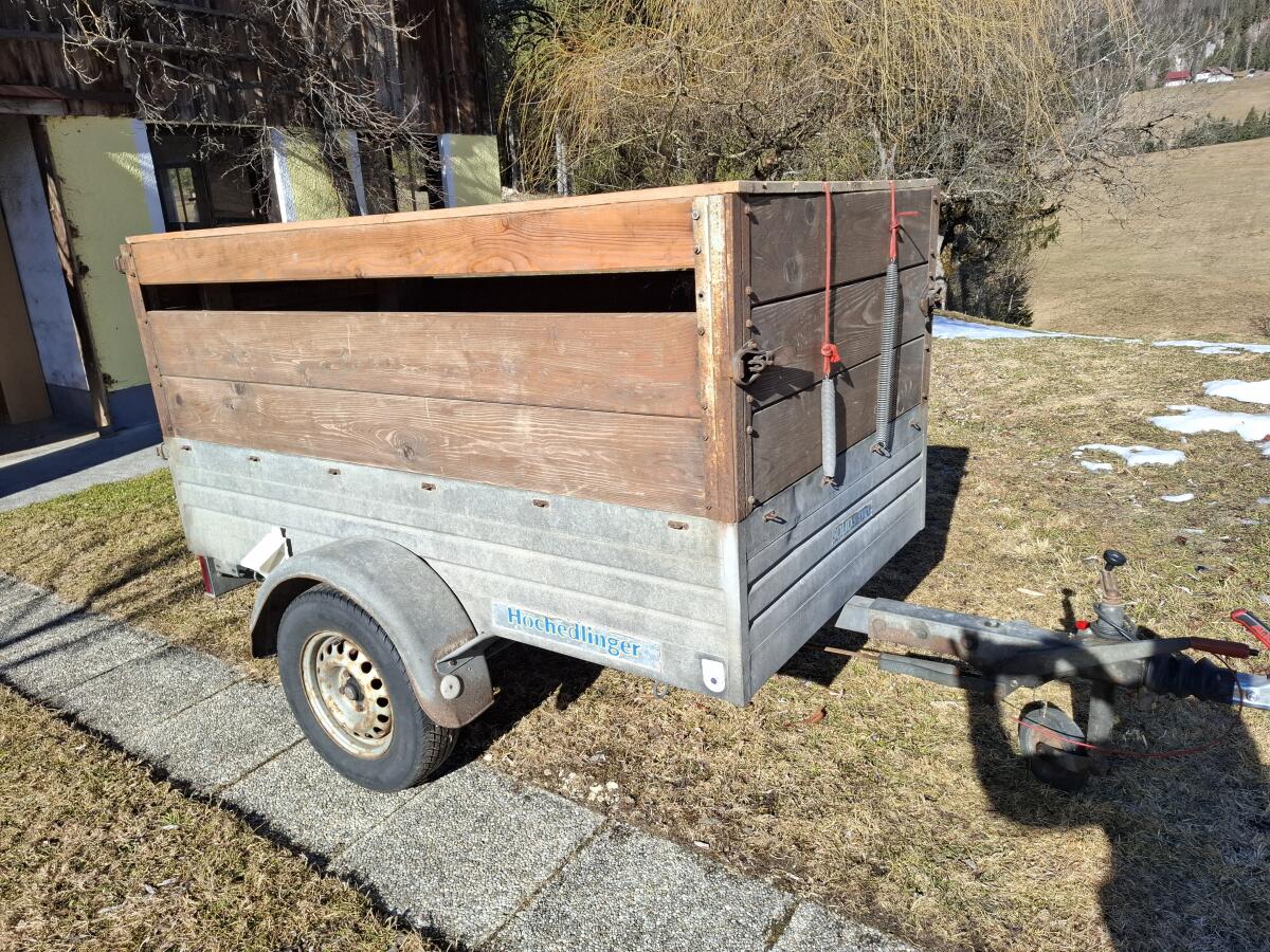 Autoanhänger zum Verkauf, Einachsanhänger, Auflaufbremse, ideal für Schaf- und Ziegentransport. Hochedlinger Solid 2000 S 210 G, Eigengewicht 250 kg, höchst zul. Gesamtgewicht 1.000 kg, höchst zul. Nutzlast 750 kg, L 2.030, B 1.100, H 980. Pickerl 02/2027.