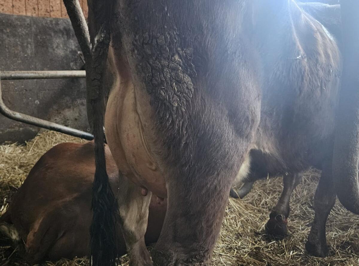 Verkaufen Braunvieh Zuchtstierkalb. Geboren am 29.12.2025. Einsatzleistung der Mutter 30 l. Genetische Zuchtwerte sind noch in Bearbeitung.