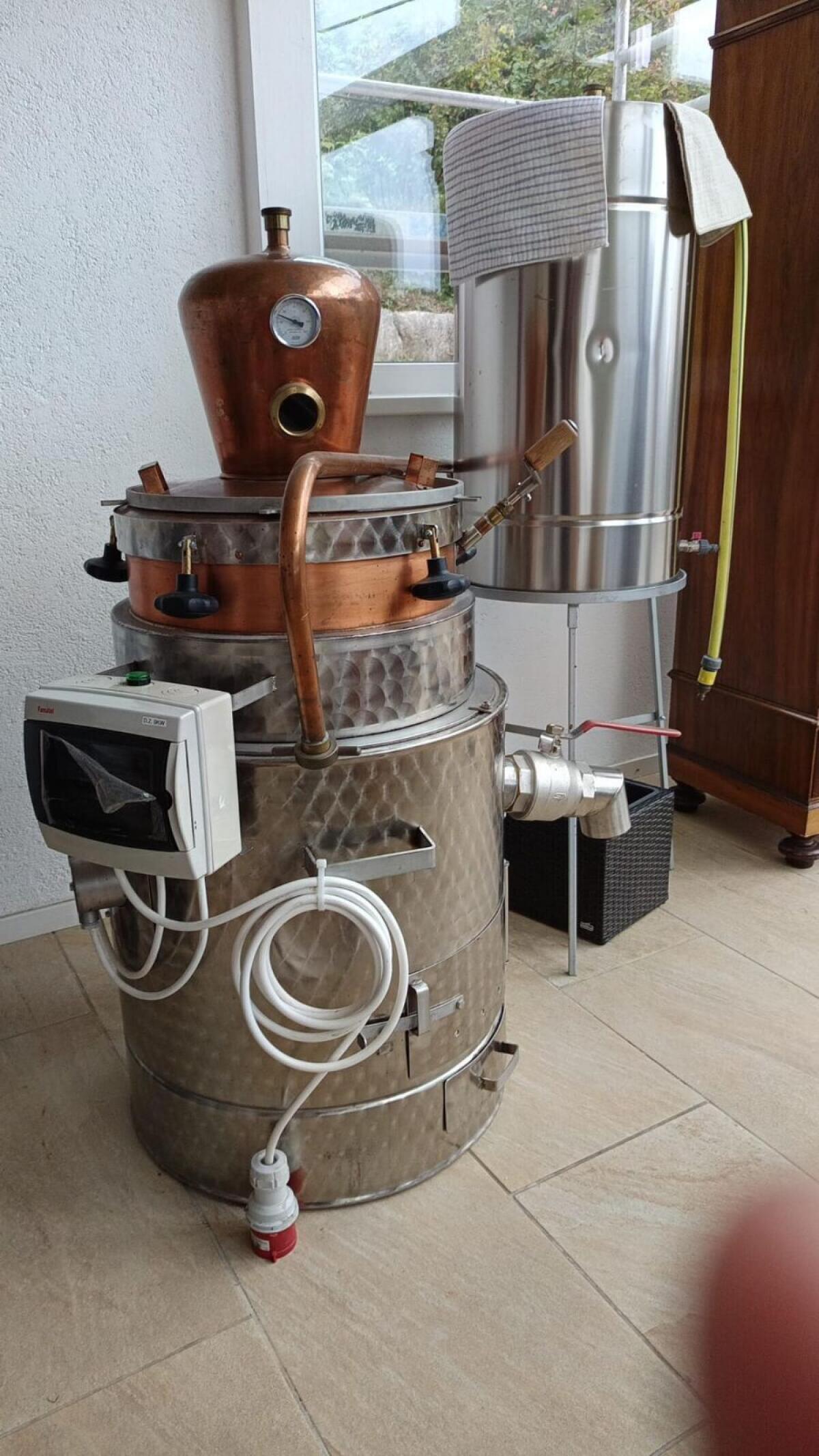 Verkaufe neuwertige Destillieranlage Kovodel Janča (Typ 75). Doppelmantel-Kessel (Wasserbad) gegen Anbrennen, 75 l Kessel (max. 50 l Maische). Brennblase aus Kupfer, Rest Edelstahl. Genaue Steuerung über 9 kW E-Heizung (Starkstrom). Zustand: Technisch & optisch top, sofort einsatzbereit. Inkl.: Kessel, Rührwerk, Heizung, Steuerung, Edelstahl-Kühler mit Vorlage & alle Papiere. Wichtig: Gesetzliche Bestimmungen (Zoll) beachten! Besichtigung/Abholung in 73262 Reichenbach. Privatverkauf ohne Garantie/Rücknahme. Nur ernsthafte, fachkundige Anfragen.