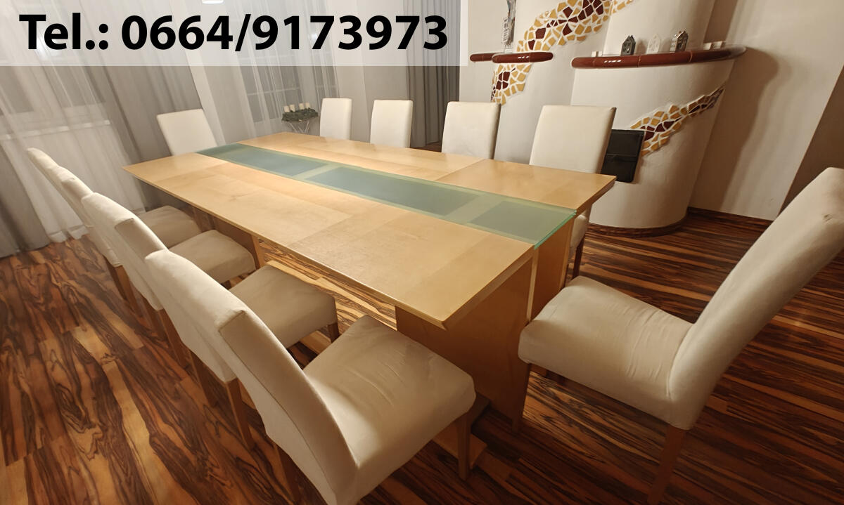 Tischlergefertigter Esstisch mit Glaseinsatz, inkl. 11 Stk. Stühle (1 Stk. Reserve, daher am Bild nicht sichtbar), Stühle sind mit einem waschbaren Mikrofaserbezug bezogen, Esstischgröße: B 120 cm, L 250 cm, H 76 cm, Hinweise: Sofort verfügbar, Gebrauchsspuren vorhanden, Mithilfe beim Verladen, keine Rücknahme nach Abholung der Teile möglich, Privatverkauf, keine Garantie oder Gewährleistung.