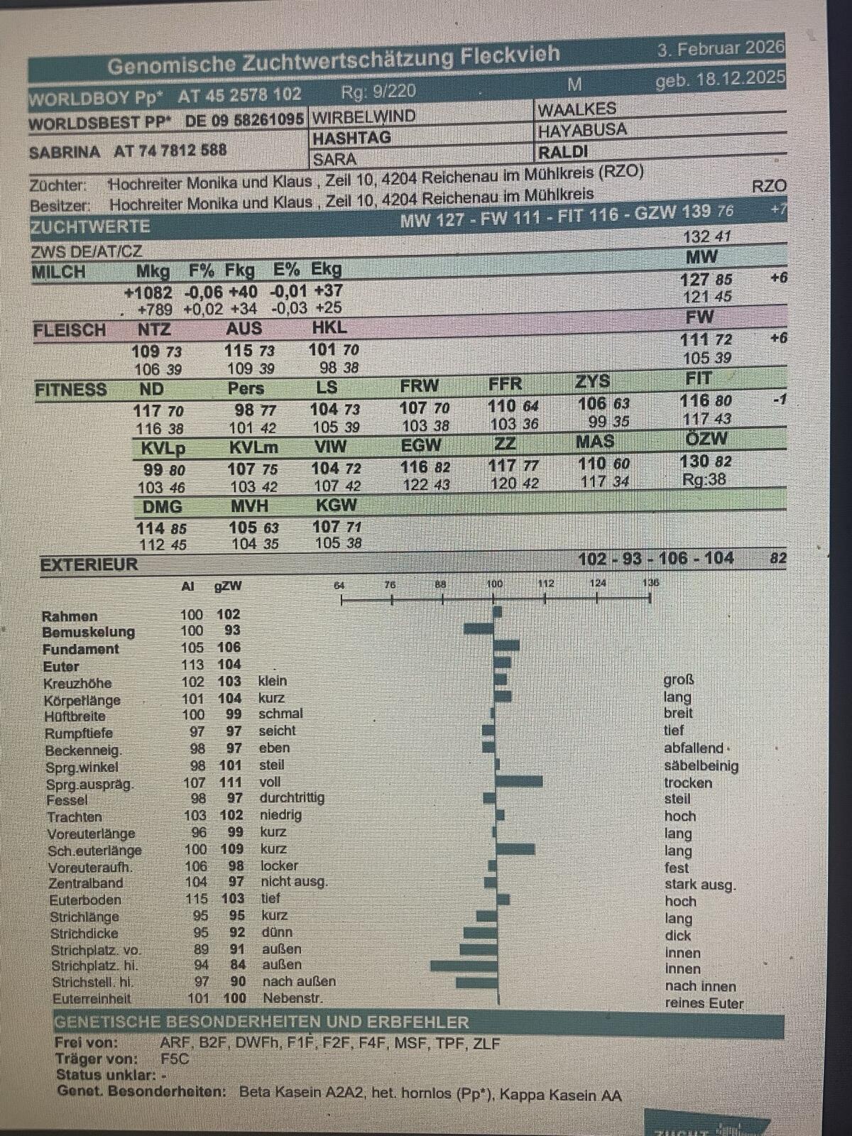 Verkaufe Zuchtstierkalb mit GZW 139, geb. 18.12.2025. Interessante Linienführung aus Top Kuhfamilie. Fotos vom Kalb sowie Kuhfamilie auf Anfrage.