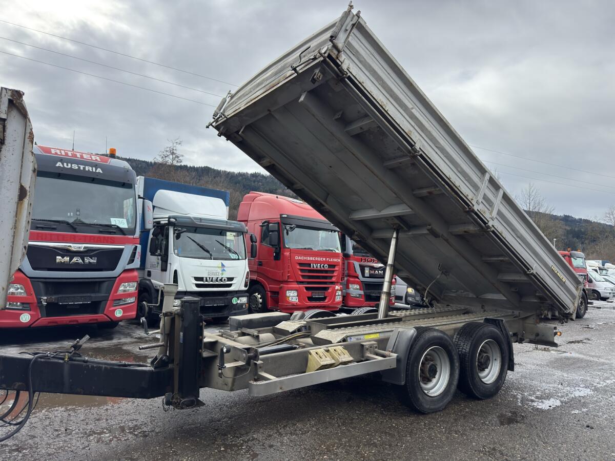 Humer LTK 14 Dreiseitenkipper und Auffahrrampen, Länge Ladefläche: 5,10 m, Breite: 2,40 m, 10 t Rampen 3,50 m lang, Bj. 2014, Nutzlast 10.240 kg, Eigengewicht 3.760 kg.