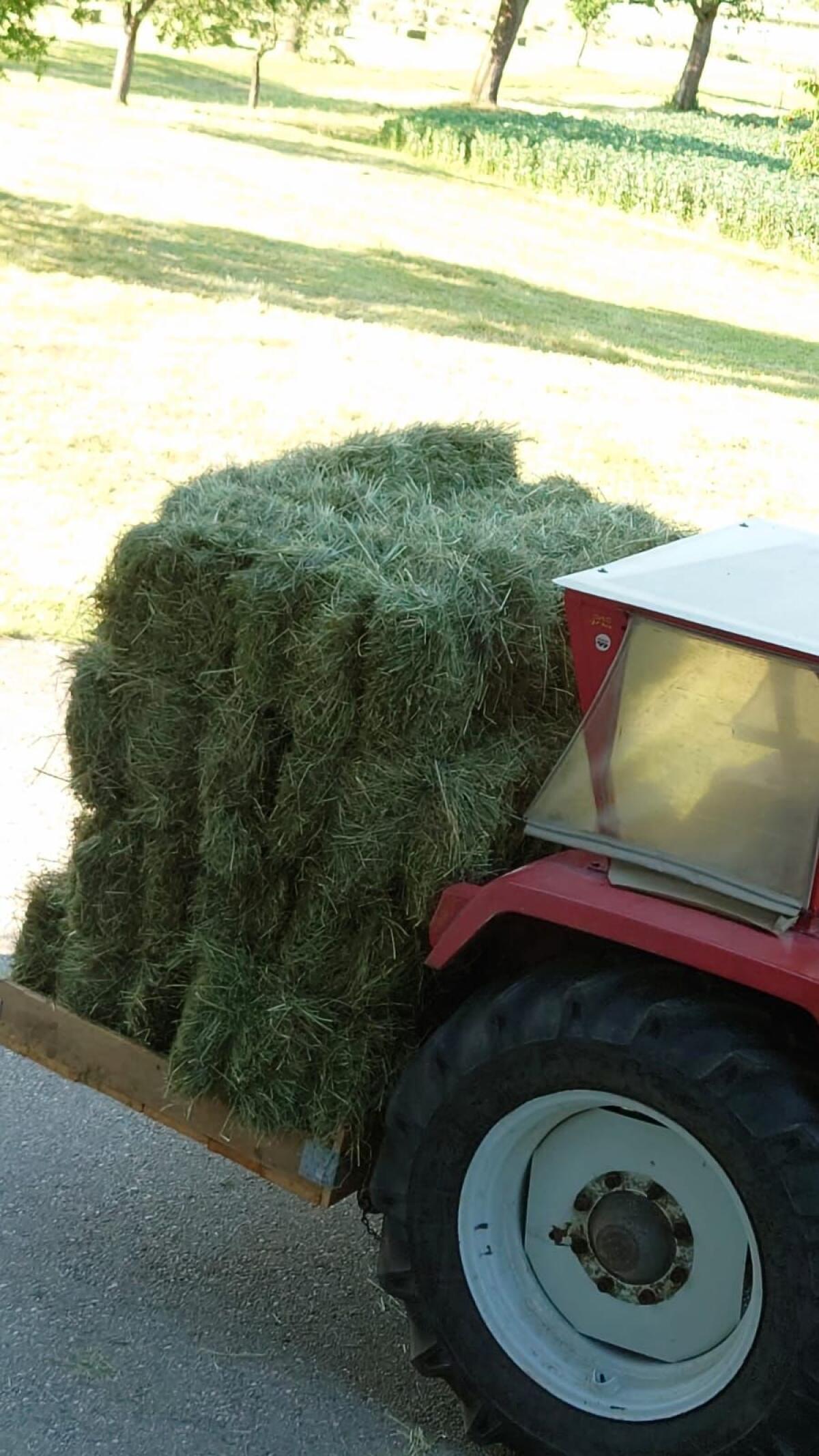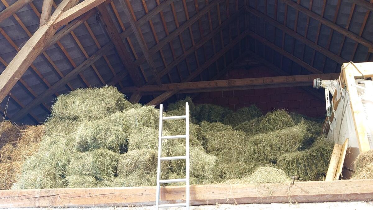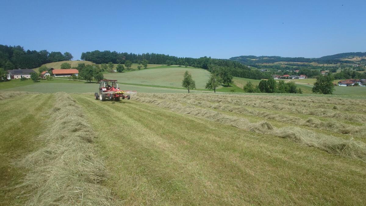Gemäht (ab 10. Juni) mit Doppelmessertechnik und schonend geworben. Trocken im Heustadl gelagert.