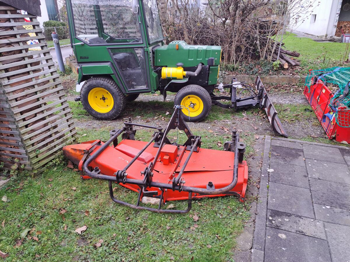 Hako 3800 D mit Mähwerk, Schneeschild und Schneeketten, Bj. 1980, ideal für Streuwiesen, da der Traktor niedrig und schmal ist, Breite: 105 cm, Mähwerk: 183 cm breit mit Auswurf, Schneeschild: 200 cm breit, guter Zustand, beheizbare Kabine, Selbstabholung, Versand gegen Transportkosten.