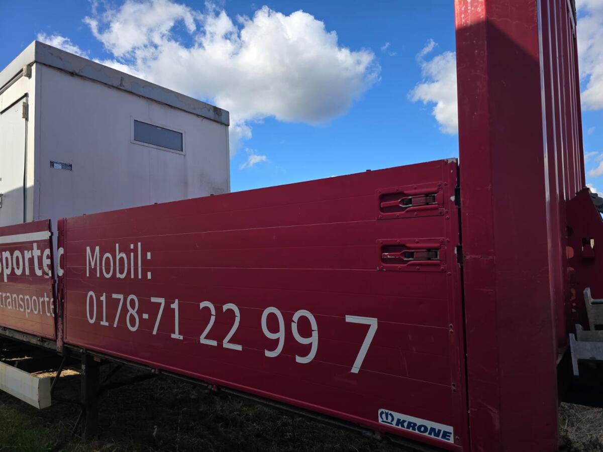 Krone Sattelauflieger – Offen mit Bordwänden – Farbe Rot Beschreibung: Verkauft wird ein zuverlässiger Sattelauflieger der Marke Krone in offener Ausführung mit Bordwänden. Marke: Krone Ausführung: Offener Auflieger mit Bordwänden Farbe: Rot Baujahr: (wird nachgereicht) Zustand: Einsatzbereit Aktuell ist ein großer WC-Container auf dem Auflieger gelagert. Sollten Sie Interesse an dem Container haben, kann dieser gerne mit erworben werden – sprechen Sie uns hierzu einfach direkt an! Der angegebene Preis bezieht sich auf den leeren Auflieger. Detaillierte Fotos werden in Kürze hochgeladen. Kontakt: Bei Fragen oder Interesse erreichen Sie mich telefonisch unter: Tel.: [Telefonnummer entfernt]