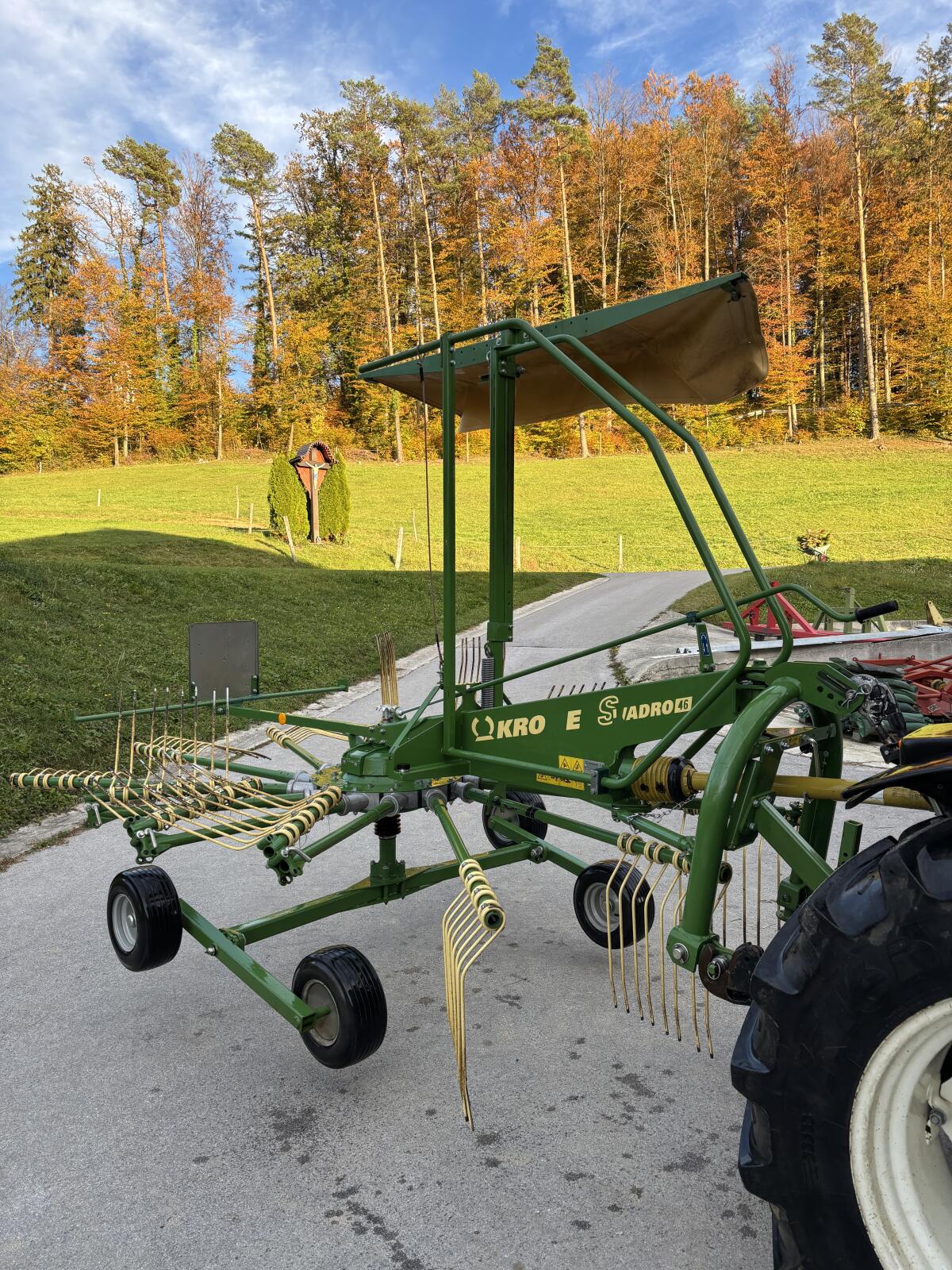 AB: 4,60 m, Schwadbreite: ca. 0,80-1,80 m, 13 Zinkenarme, davon 7 klappbare Zinkenarme, Kreisdurchmesser: 3,60 m, 4 Doppelzinken pro Arm, Tandemachse, Zapfwelle, höhenverstellbares Fahrwerk.