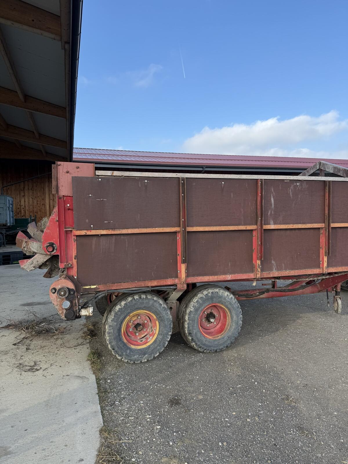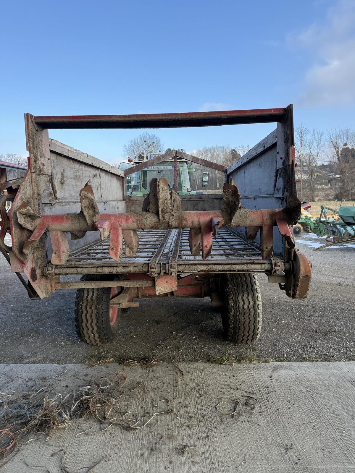 Verkaufe alten Miststreuer, Aufbau Eigenbau, tschechisches Fabrikat, aber Genaueres unbekannt. Hydraulische Schubkette, neue Reifen.
