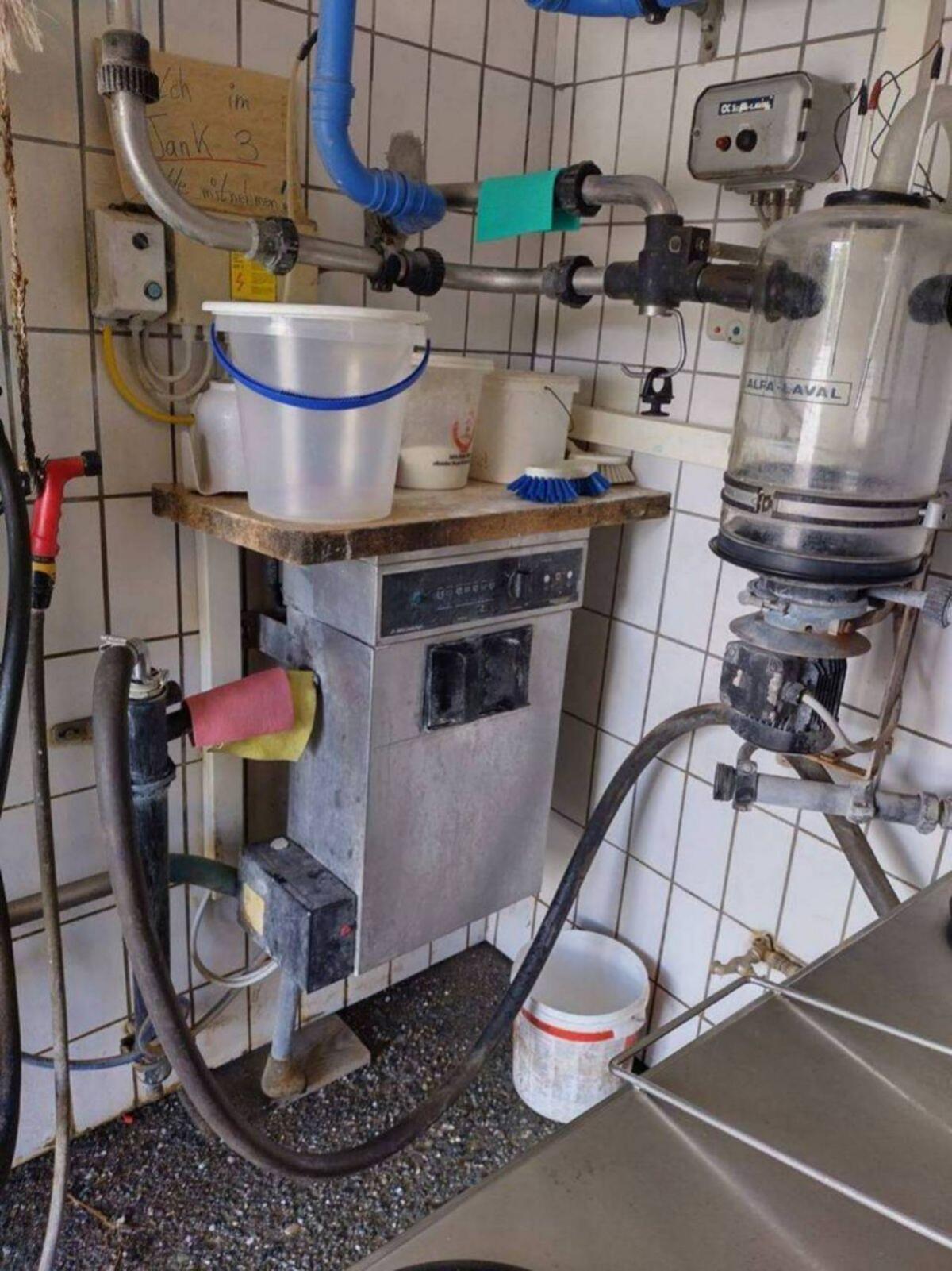 De Laval, 2 x Melkzeug, Vakuumpumpe, Waschautomat mit Aufnahme für 4 Melkzeuge, Sammelbehälter, Leitungslänge 23 Kühe, wegen Umbau auf Melkstand. Bereits alles abgebaut. Verkauf von Einzelteilen möglich.
