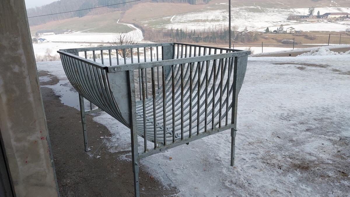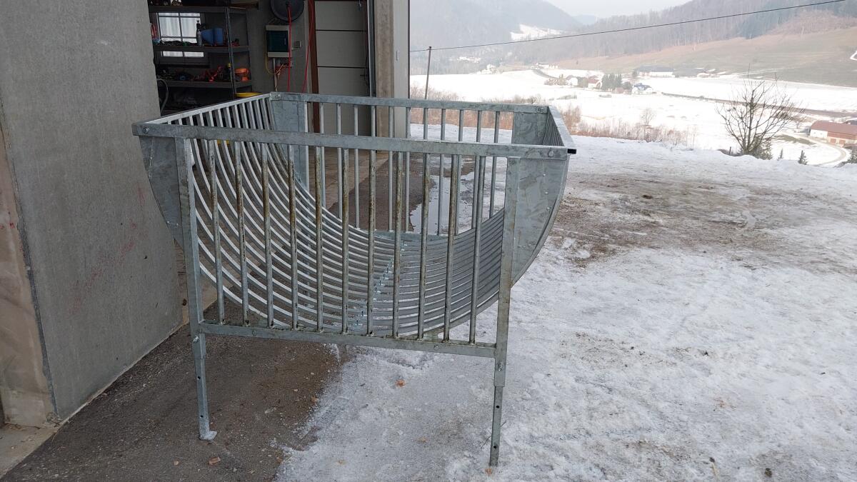 Verkaufe 1 Jahr verwendete Futterraufe für Schafe und Ziegen. Bis 1,4 m Ballendurchmesser, höhenverstellbar. Optional wäre eine Überdachung bestellbar.