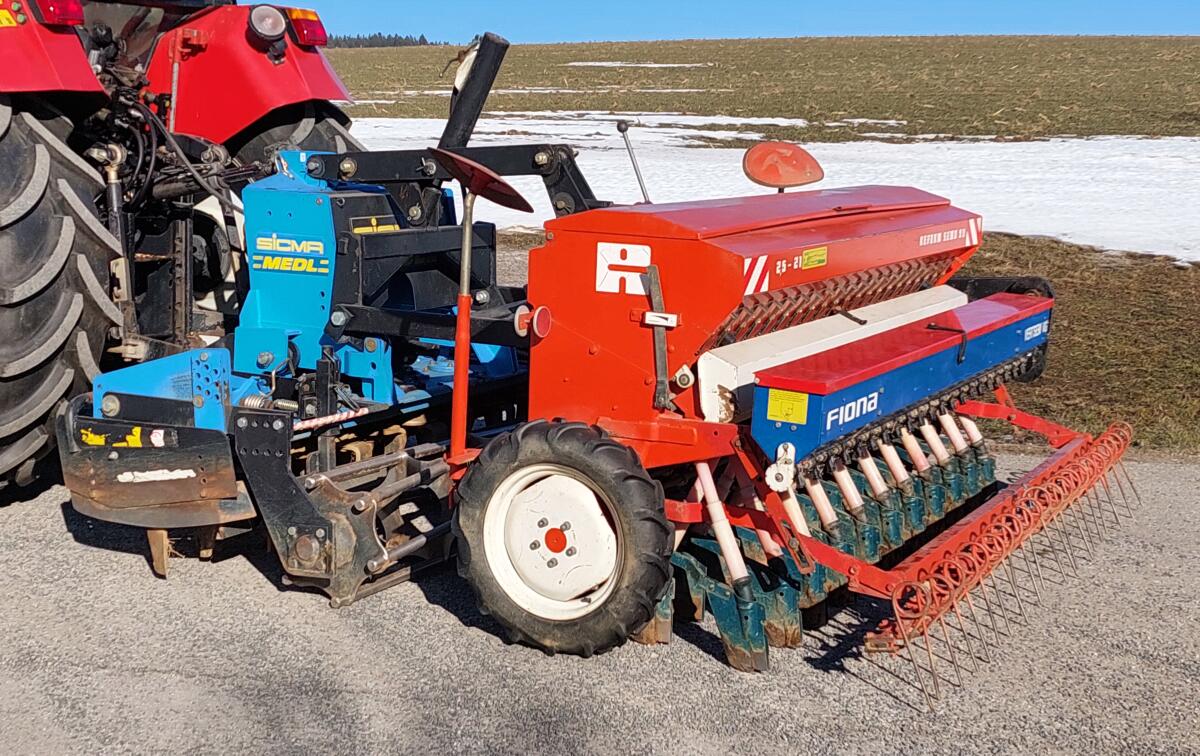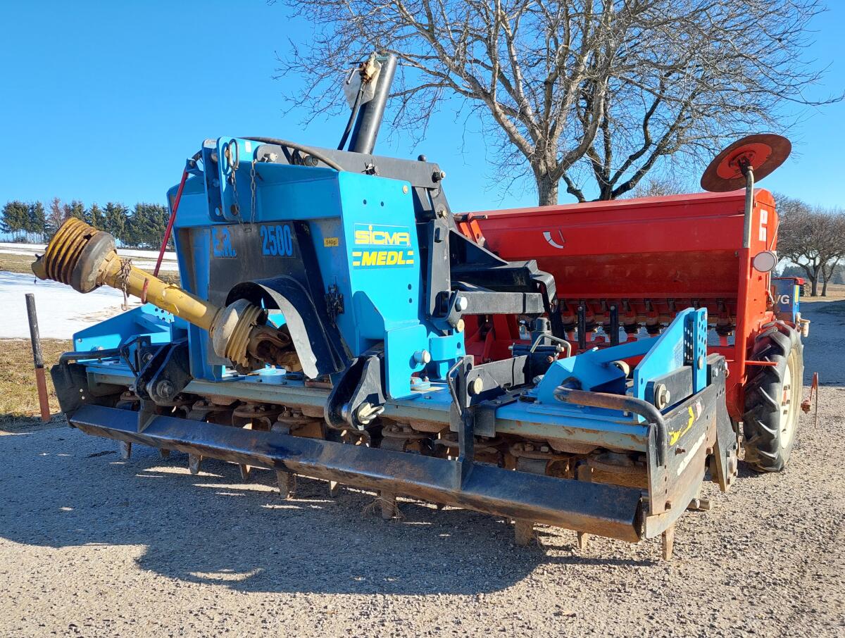 Kreiselegge Sicma E.R. 2500, Planierschild vorne und hinten, hydr. Hubwerk, Stabwalze, Gelenkwelle mit Nockenabschaltung, Zinken 2024 neu montiert, Sämaschine Reform Semo 99, Spurreißer, 21 Schleppschare, Fiona Feinsaatsämaschine neuwertig, Säkombi in gepflegtem Zustand.