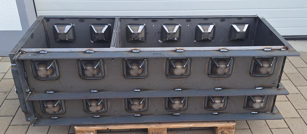 Angebot beinhaltet eine Betonschalung zum Fertigen von Betonlegosteinen. Fertig geschweißt, geschliffen, nicht beschichtet. Maße der Steine: Länge: 180 cm, Breite: 60 cm, Höhe: 60 cm. Erhältliches Zubehör: Trennwand für zwei 1/2 oder 1/3 und 2/3 Steine, Einlegeplatte oben für glatte Steine oben, Schrägabtrennung 45° für abgeschrägte Steine seitlich, Einleger L-Abschlusssteine, Querschnitt nach Kundenvorgabe. Lieferumfang: Schalung bestehend aus 2 L-Teilen, Bolzen und Splinte, Löcher für optional erhältliches Transportsystem vorhanden: Hülsenanker oder Kugelkopfanker. Sie erhalten eine Rechnung mit ausgewiesener MwSt. Angebotene Preise Netto zzgl. 19%. Lieferzeit ca. 1 Woche.