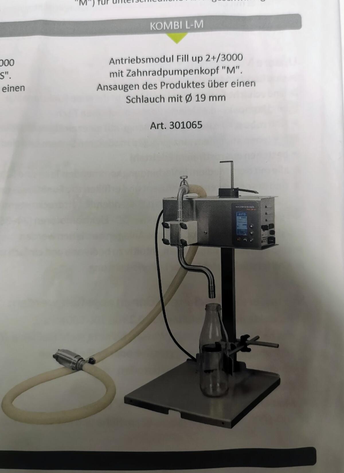 Neuwertiges Set für niedrigviskose Abfüllung wie Milch, Öle, Fruchtsäfte, Sirup, Trinkjoghurt. Passt auf das Grundgerät Fill Up 2+.