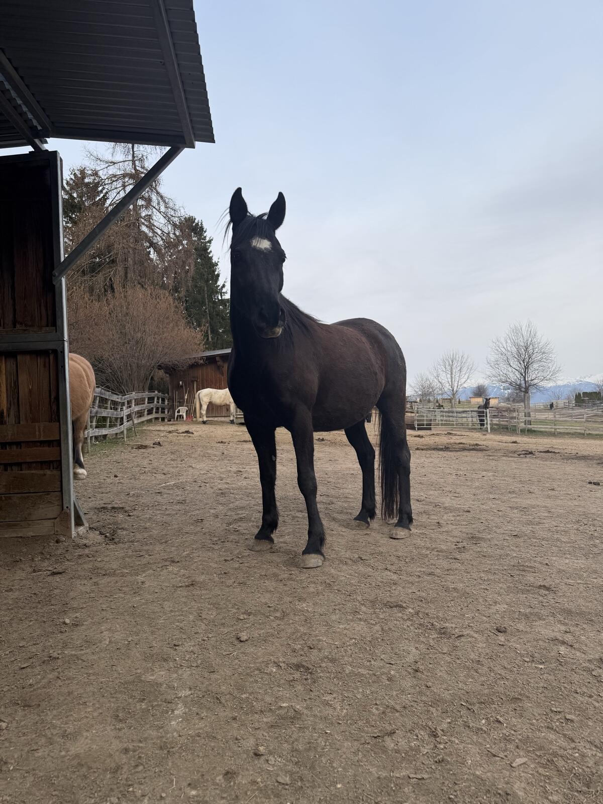 Vollblut-Araber Stute, schwarz mit kleinem Stern. Eine beeindruckende Stute mit ausdrucksstarken Gängen und viel Feuer. Sie möchte gefallen und arbeitet gerne mit, hatte jedoch in der Vergangenheit leider schlechte Erfahrungen gemacht – daher nicht immer ganz einfach und kein Anfängerpferd. Trotz allem möchte sie unbedingt bewegt werden und sucht einen ruhigen, verständnisvollen Menschen mit Herz. War schon auswärts unterwegs: Dressurkurs, Sitzschulungskurs, Working Equitation Kurs, Wanderreiturlaub, mehrtägiges auswärts Training. Ist Trailparcours erfahren, kann Freiarbeit, Seitengänge, einparken. Abgabe schweren Herzens aus persönlichen Gründen – Platz vor Preis.