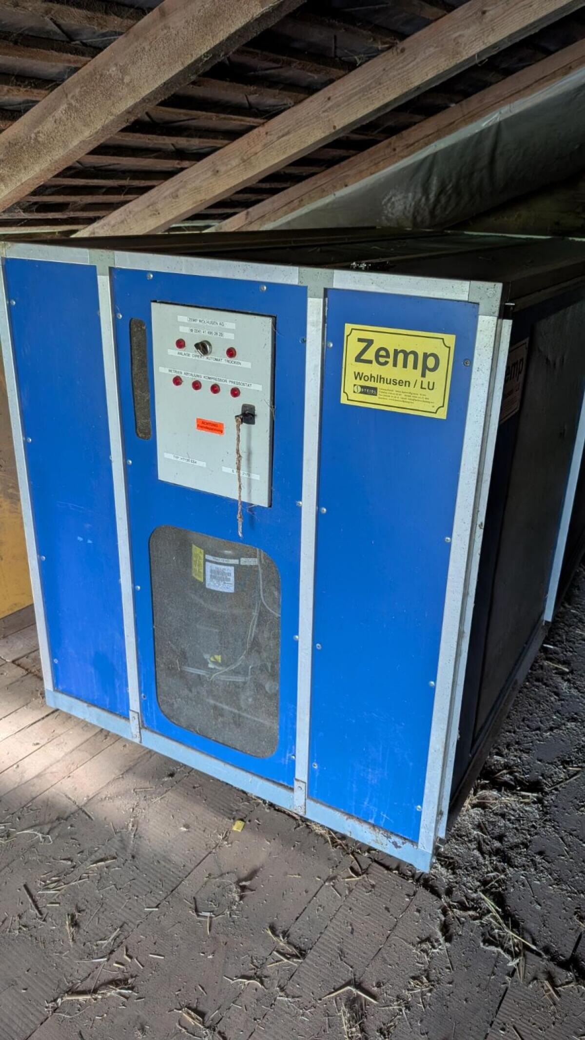 Zemp Heutrocknungsanlage HT30 – 9,5 kW. Bstd.: 1.043. Für ca. 60–70 m² Heubox. Kältemittel R507, 13 kg. Zum Verkauf steht eine zuverlässige Heutrocknungsanlage Zemp HT30 mit 9,5 kW Leistung. Ideal für die effiziente Trocknung von Heu in kleinen bis mittelgroßen Boxen. Die Anlage ist in gutem technischen Zustand und sofort einsatzbereit. Auf unserem Hof war sie aufgrund der begrenzten Anschlusskapazität in den letzten Jahren nicht im Einsatz, Trocknung nur mit Holzofen.