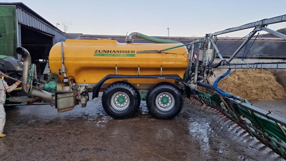Zunhammer K11PU Pumptankwagen, Farmlandfix 12 m, guter Zustand, Bj. 2005. Bereifung 600/55-22.5 mit 2 neuen Reifen für hinten noch nicht montiert, Drehkolbenpumpe 3.850 l/min wurde 2024 komplett erneuert, Untenanhängung mit hydr. Stützfuß, Steinfangkasten mit Rotocut 5000, Handy Saugarm NW 200 li., Farmlandfix Schleppschuhverteiler 12 m (Bj. 2014), 48 Abgänge, 2x EXA CUT ECL 24, Load-sensing Joystick Steuerung.