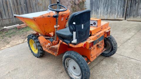 Dumper, Bj. 1994, Motor 8, 8 kW, Nutzlast 1.400 kg. Antrieb vorne. Mulde li. und re. drehbar, Breite: 130 cm, Länge: 150 cm, Kubatur: ca. 1, 3 m³. Absolute Abmessungen