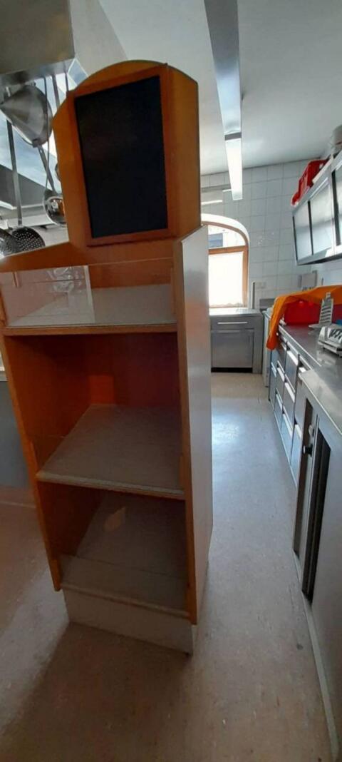 Verkaufe neuwertiges Verkaufsregal, Vitrine mit Glas und Beschriftungstafel, sehr stabil für Brot usw. Höhe 190 cm, Breite 55 cm, Tiefe 45 cm. Matériels de vente dir