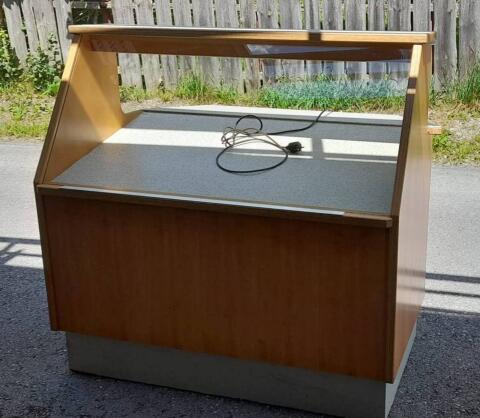 Verkaufe Verkaufsvitrine, top Zustand, sehr stabil mit Glascheibe und Beleuchtung auf Rollen. Brotverkauf usw. Breite 131 cm, Tiefe 90 cm, Höhe 128 cm. Matériels de